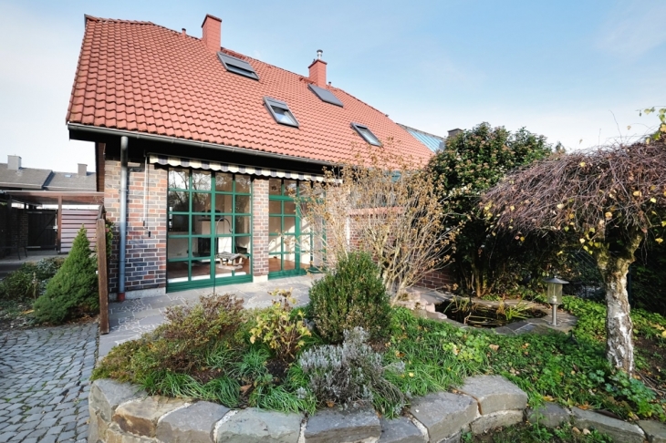 Die Umsetzung des offenen Wohn-Essbereiches im Splitlevel mit bodentiefen Fenstern zum Gartengrundstück ist nicht nur individuell, sondern vermittelt ein besonderes Gefühl der Behaglichkeit. Der zentral positionierte Kamin und schönes Kirschbaum-Parkett auf der unteren Wohnebene unterstreichen dieses Raumambiente. Bodentiefe Sprossenfenster bieten einen sehr schönen Blick auf die Naturstein-Terrasse und das liebevoll angelegte Gartengrundstück. Da weitere Grünanlagen an das Grundstück anschließen, ist man hier herrlich ungestört und kann die warme Jahreszeit in vollen Zügen genießen.