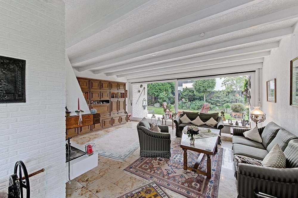 Beim Betreten der ca. 114m² großen Erdgeschosswohnung gelangt man in eine geräumige Diele mit wohnlichem Charakter. Schlafzimmer und Tageslicht-Badezimmer mit Dusche und Badewanne verfügen über einen separaten kleinen Zugangsbereich und genießen somit zusätzlich Privatsphäre. Die offene Gestaltung von Wohnzimmer und Essbereich wird in ihrem modernen Wohnraumkonzept ergänzt durch den Split-Level auf zwei Ebenen und einen zentralen, offenen Kamin. Hochwertiger Travertin-Boden bildet eine schöne homogene Bodenfläche. Aktuell ist die vorhandene Küche geschlossen angelegt, kann jedoch jederzeit problemlos zum Wohnbereich geöffnet werden. Über ein Schiebeelement der großen Fensterfläche gelangt man auf die Terrasse und in den Garten, welcher im Winkel um das Haus liegt.