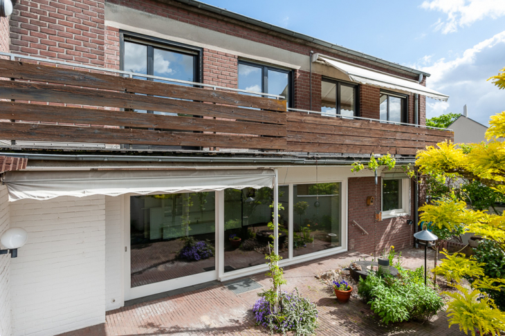 Die Erdgeschosswohnung hat kürzlich ein barrierefreies Badezimmer mit bodenebener Dusche erhalten. Dieses passt mit seiner zurückhaltenden Farbgebung gut zur Ausstattung der restlichen Wohneinheit, in der hochwertige Schieferböden im Kontrast mit weißen Backsteinwänden die Gestaltung dominieren. Das Erdgeschoss verfügt weiterhin über ein separates Schlafzimmer, eine Küche und den großen Wohn-Essbereich, der sich über eine Glasfront mit Schiebetür an den kleinen, aber bezaubernden Außenbereich anschließt. Mit der nach Süden ausgerichteten Terrasse erwartet Sie ein geschützter und mit liebevoller Hand gestalteter Wohngarten. Die Blüten von Hortensien und Clematis und der Duft von Rosen und mediterranen Kräutern begleiten Ihre Mußestunden in dieser Oase der Ruhe.