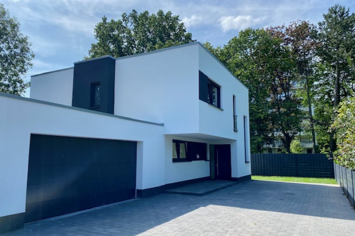 Sofort auffällig ist das äußere Erscheinungsbild des Neubaus im Bauhaus-Stil mit klaren Strukturen des Baukörpers. Die Vorsprünge, die farbliche Gestaltung in Verbindung mit der sehr moderne Formensprache und der stringente Stil der Innenraumgestaltung verbinden sich hier zu einem Domizil der Extraklasse.
