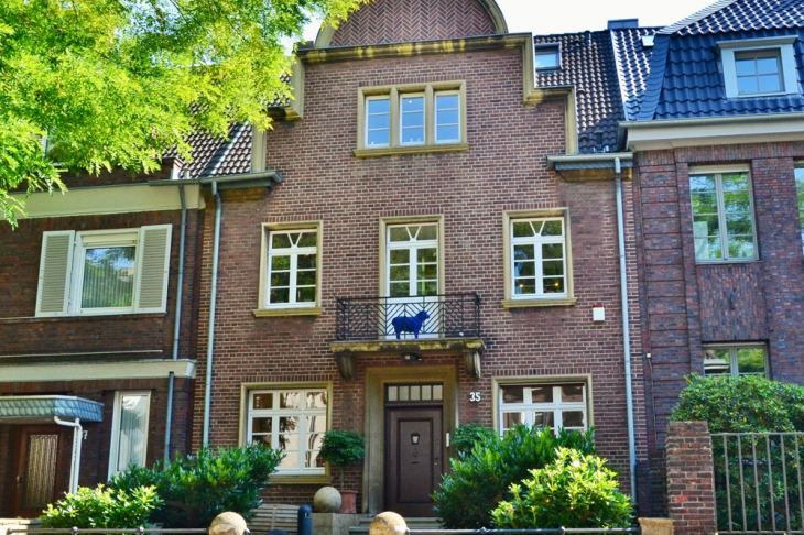 Diese einzigartige traufständige Stadthausvilla steht in der Flucht der Häuserzeile und stellt mit ihrer stark differenzierten Oberflächenstruktur ein Musterbeispiel der Verbindung zum Backsteinexpressionismus und Art Deco dar.
