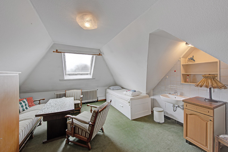 Das Obergeschoss beherbergt ca. 92 m² Wfl. verteilt auf ein Wohnzimmer mit Loggia und Gartenausblick, ein Schlafzimmer, eine geräumige Küche und ein Wannenbad. Der Spitzboden ist über eine leicht steile Treppe zu erreichen. Zwei Räume und ein kleines Duschbad mit WC dienen mit ca. 27 m² als wohnlich ausgebaute Nutzfläche. Auch hier steht eine individuelle Grundrissänderung in Betracht. Die Ausstattung der oberen gepflegten Räumlichkeiten entspricht maßgeblich dem Jahr des Um- und Anbaus.