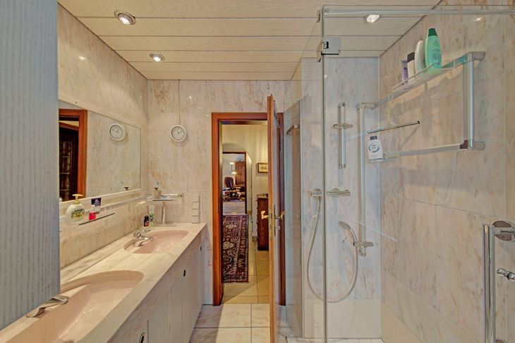 - Fußböden überwiegend Massivholz-Parkett sowie Solnhofener Natursteinfliesen, Textilbelag und PVC