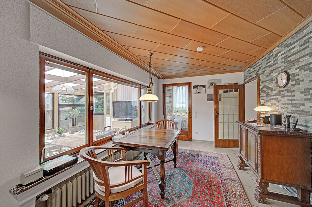 Die vollunterkellerte Immobilie verfügt über eine äußerst gute und gepflegte Bausubstanz. Insbesondere das Erdgeschoss, welches von den Eigentümern selbst bewohnt wird, wurde erst im Jahr 2020 vollständig renoviert und im vergangenen Jahrzehnten anspruchsvoll modernisiert. Eine stattliche Wohnebene mit ca. 127 m² Wfl. vermittelt durch das edle Echtholz-Parkett, die Solnhofener Platten und den Kachelofen mit Sitzgelegenheit eine gemütliche und typische Landhaus-Wohnatmosphäre. Ein über die gesamte Breite des Hause angebauter Wintergarten mit Kaminofen, lässt den Garten und die Natur zu einem ganzjährigem Erlebnis werden. Von hier eröffnet sich ein erhabener Blick in den herrlichen Garten. Ein sensationelles Grundstück mit ca. 835 m².