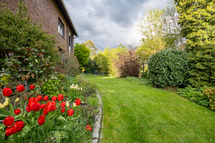Der liebevoll gepflegte Garten mit Stauden- und Gehölzbeeten und großen Rasenflächen in sonniger Südwestausrichtung ist rundum eingezäunt und größtenteils mit einer Randbepflanzung eingefasst. Hier haben Kinder noch genug Platz zum Spielen!