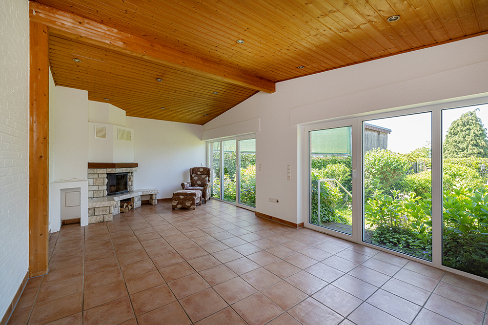 Im Jahre 2003 wurde das Erdgeschoss durch einen Anbau erweitert. Der Wintergarten ist ausgestattet mit einer Fußbodenheizung und einem großen Kamin aus Marmorbruchstein und bietet auf weiteren ca. 24 m² eine schöne Ergänzung des Erdgeschosses. Die bodentiefe Fensterfront erlaubt einen idyllischen Blick in den Garten ebenso wie einen direkten Austritt. Das Badezimmer wurde 2016 komplett erneuert und barrierefrei mit einer ebenerdigen Dusche ausgestattet. Ein großzügiges Schlaf- oder Arbeitszimmer befindet sich ebenfalls auf dieser Ebene. Des Weiteren verfügt das Erdgeschoss über je ein Gäste-WC für die untere und obere Wohnung.