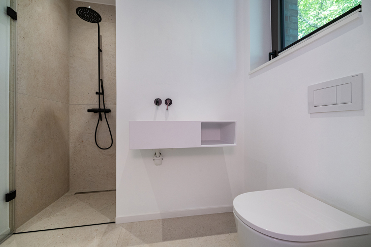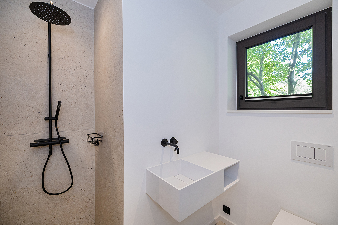 - Die beiden Badezimmer sind mit großformatigen Natursteinfliesen, bodengleichen Duschen und stilvollen Armaturen in mattem Schwarz ausgestattet und vermitteln exklusiven Wellnesscharakter.