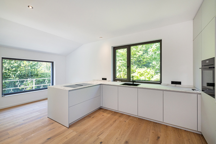 - Großflächige Fensteranlagen in Anthrazit mit hoher Energieeffizienz