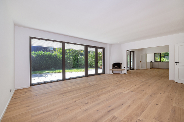 - Der großzügige Wohnund Essbereich mit Kamin und bodentiefen Fensterfronten bildet das Herzstück des Hauses. Hier verschmelzen Innenund Außenraum auf elegante Weise. Der edle Eichenparkettboden verleiht den Räumen Wärme und Wohnlichkeit.