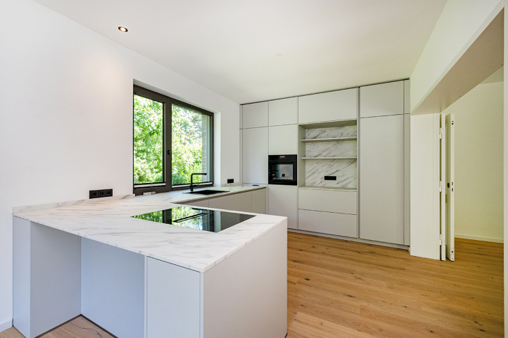 - Die moderne Designküche mit Kochinsel, hochwertigen Einbauten und Arbeitsflächen in Marmor-Optik überzeugt durch klare Linien und höchste Funktionalität.