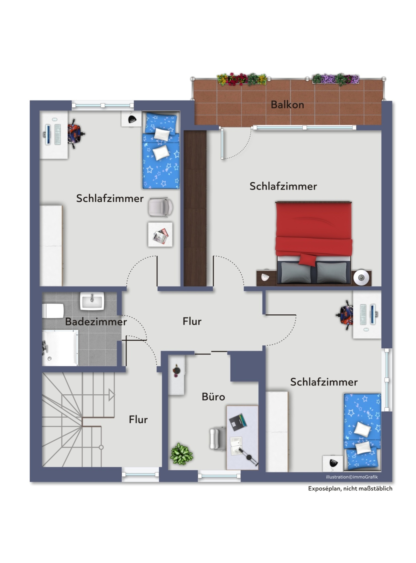 In seiner Gestaltung wurde das Treppenhaus in keinster Weise vernachlässigt und verbindet die Etagen harmonisch miteinander. Das erste Obergeschoss überzeugt mit angenehmen Raumgrößen. Diese Etage wird aktuell als separate Wohneinheit genutzt und umfasst eine einladende Diele, ein Schlafzimmer, ein Esszimmer, eine kompakte Küche, ein Tageslichtbadezimmer mit Dusche sowie ein Wohnzimmer mit Zugang zum Balkon zur Gartenseite. Im Rahmen einer Nutzung als Einfamilienhaus mit Kindern bietet sich diese Etage den perfekten Rückzugsbereich mit einzelnen Schlafzimmern an. Der durchdachte Grundriss und die warme Ausstrahlung der Böden schaffen ein behagliches Ambiente für die ganze Familie.
