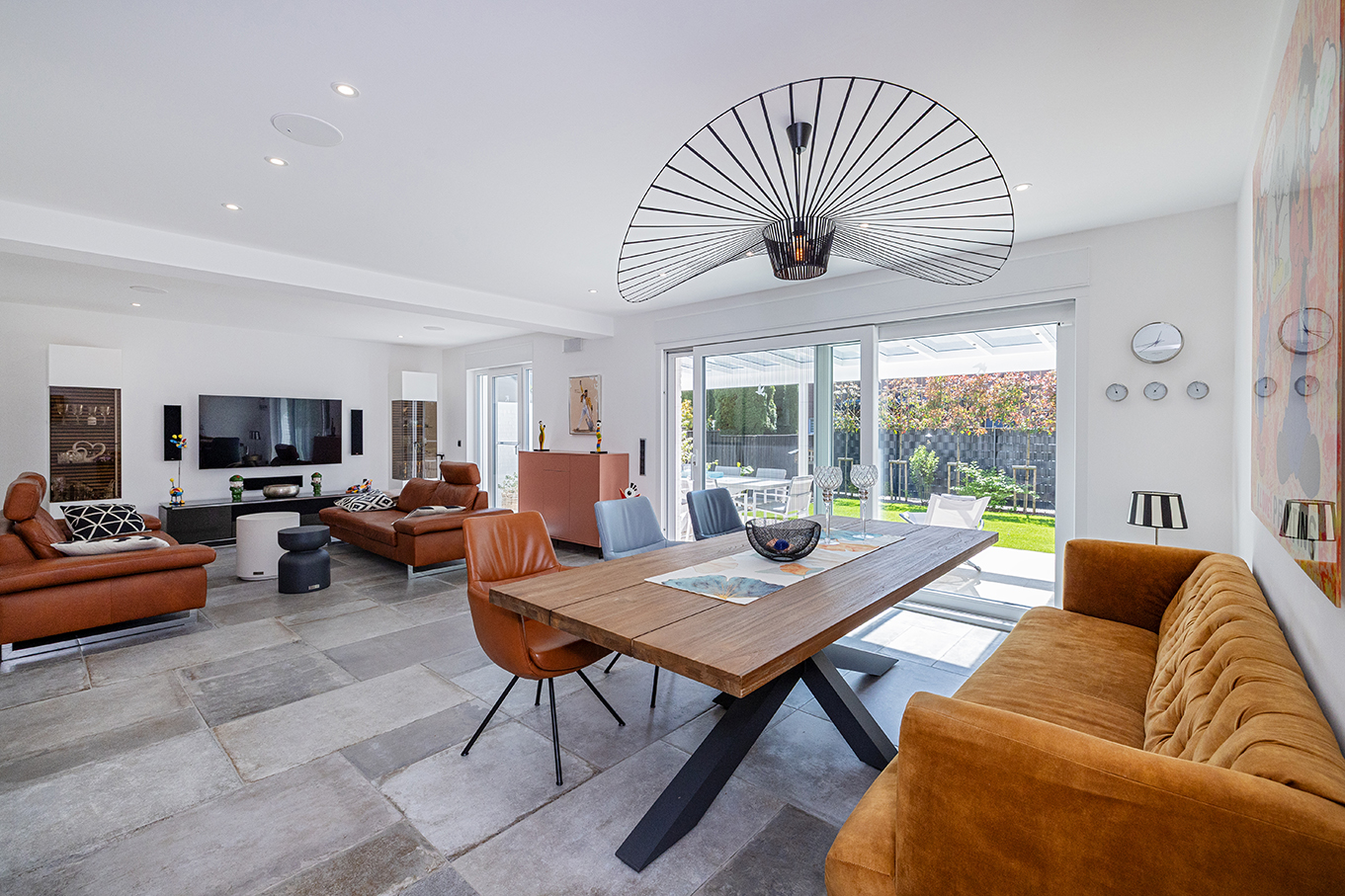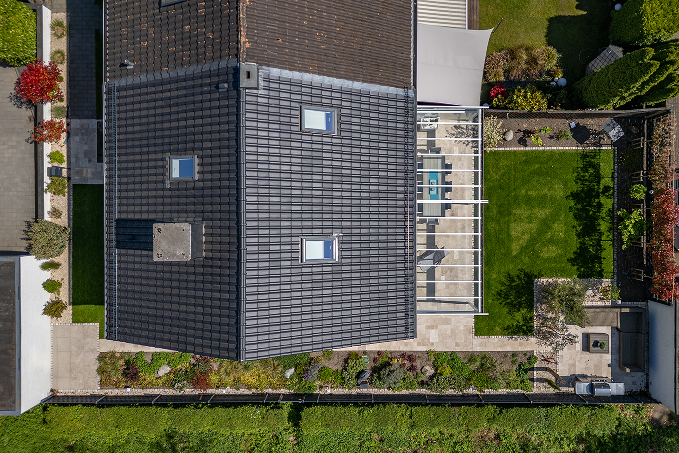 Der gesamte Außenbereich wurde neu angelegt und mit viel Liebe mediterran gestaltet. Der Fokus liegt auf einer harmonischen Gestaltung mit hochwertigen Materialien, die die Verbindung von Natur und Wohlfühlen unterstreicht. Die großzügige Terrasse am Haus bietet einen geschützten Bereich, der bei jedem Wetter zum Verweilen einlädt. Dank der eleganten Glasüberdachung und der elektrischen Beschattung können Sie sowohl sonnige Tage als auch regnerische Momente im Freien genießen. Ein zusätzliches Highlight ist die "Chill- und Grillterrasse", ein idealer Ort für gesellige Stunden mit Familie und Freunden.