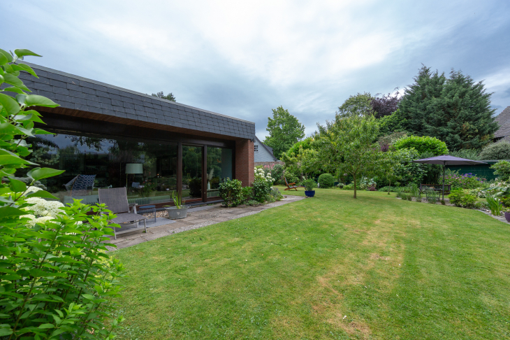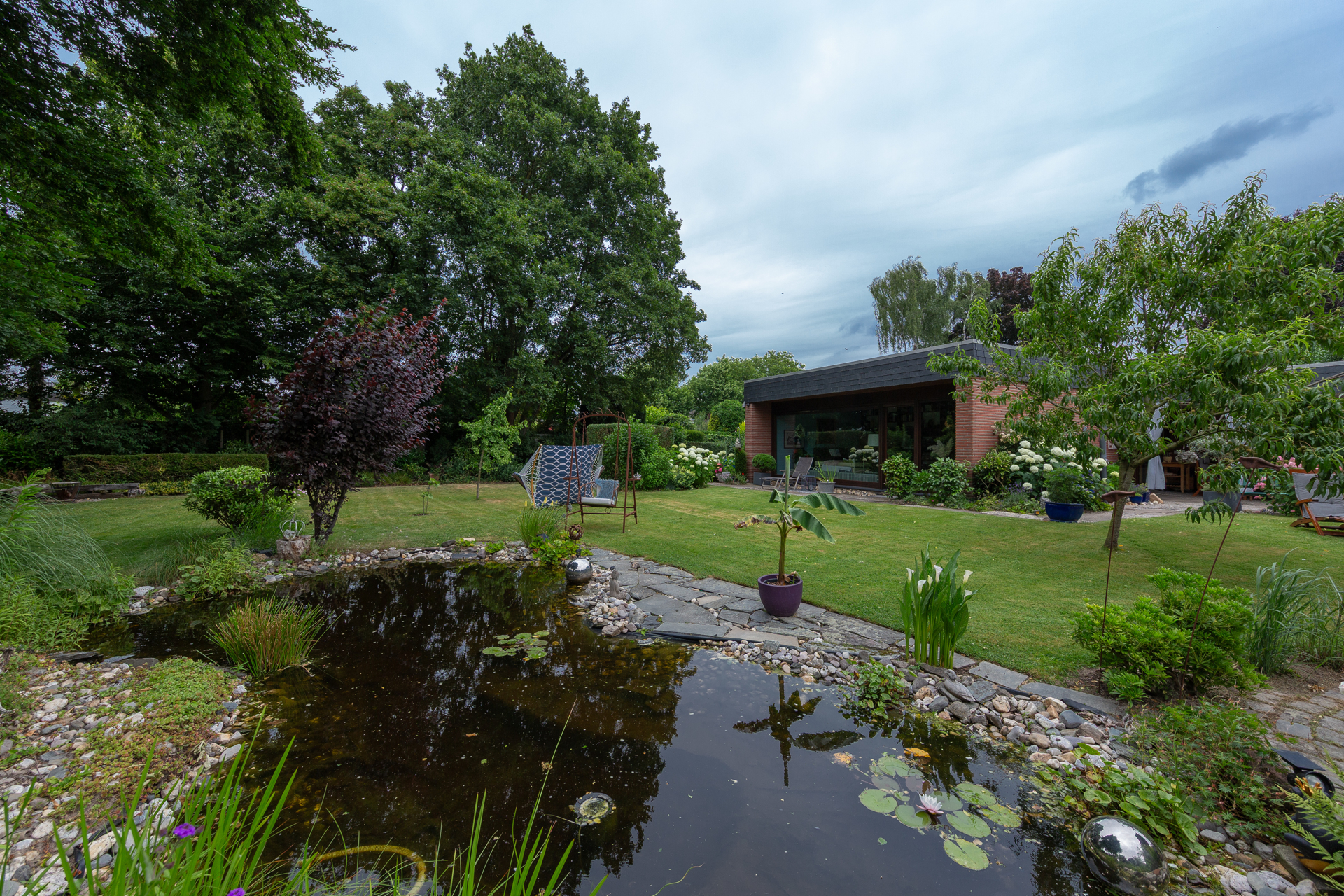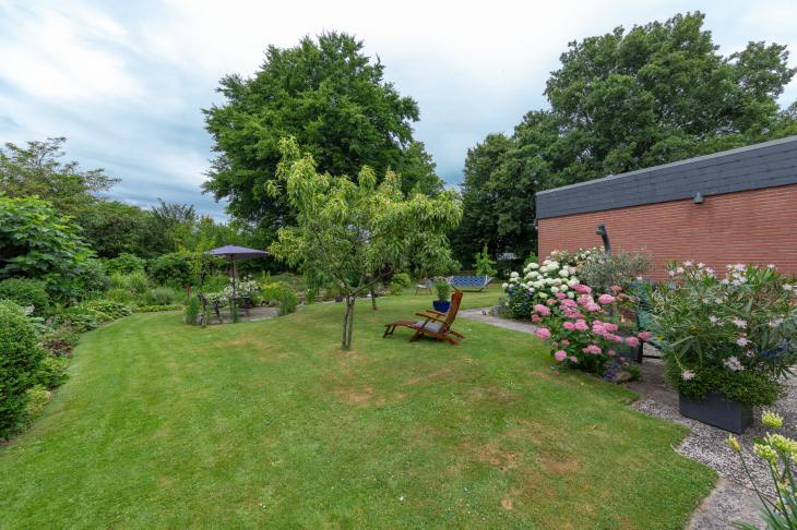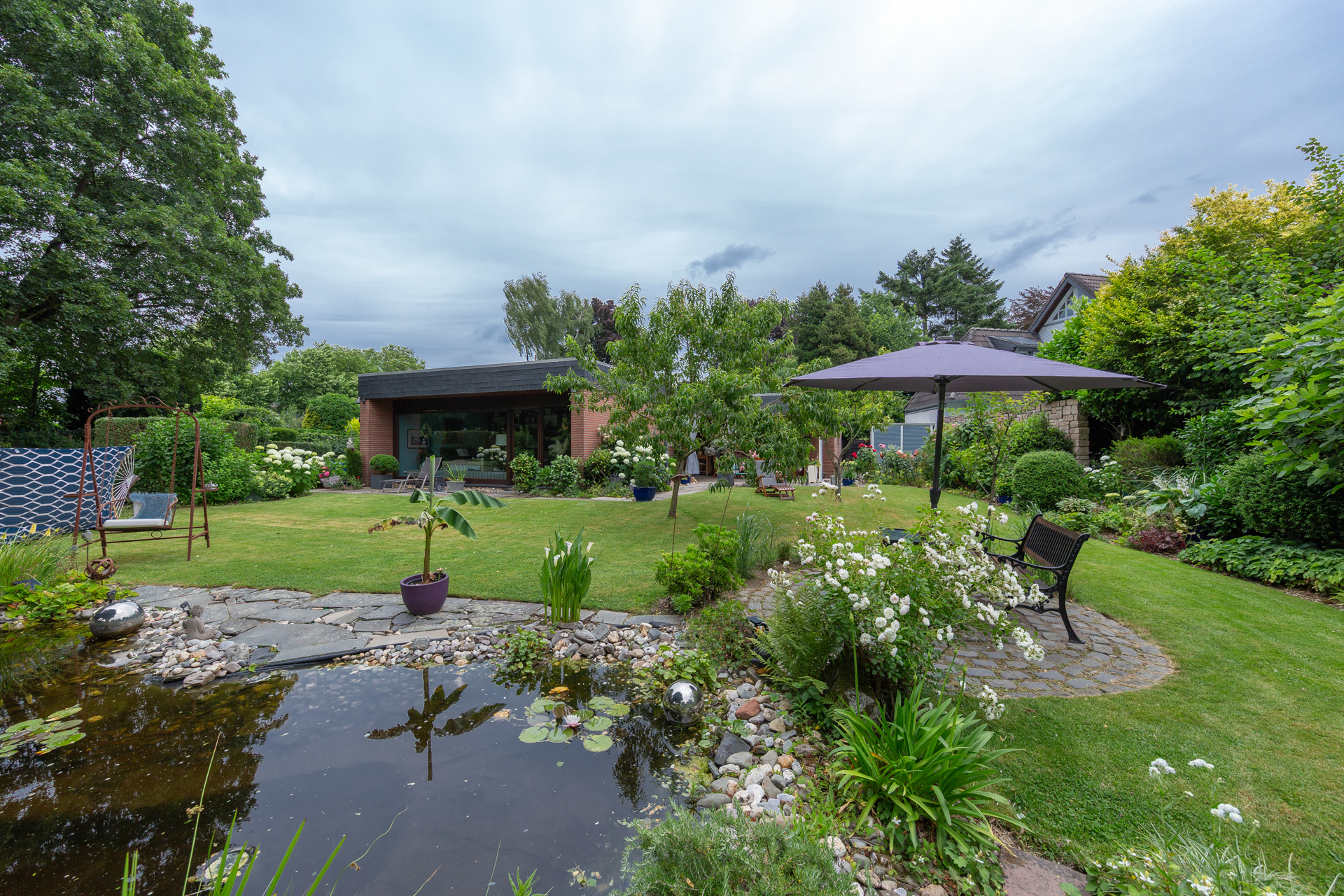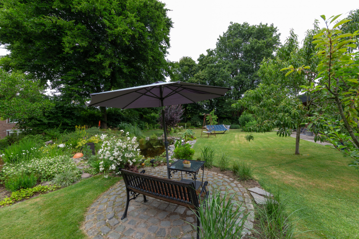 Besonders eindrucksvoll ist der weitläufige Garten: Großzügige Rasenflächen, prächtiger Baumbestand, wertvolle Pflanzen und Gewächse sowie eine malerische Teichanlage schaffen eine grüne Oase, die zum Entspannen einlädt. Drei Terrassen für jeden Geschmack: Großzügig überdachte Speisenterrassen für die große Tafel, "grill and chill", die Frühstücksterrasse am Teich oder die breit ausgelegte Sonnenterrasse mit schönstem Parkblick und eine geschützte Süd-West-Ausrichtung machen den Außenbereich zum idealen Rückzugsort. Der Aufstellpool für Wellness oder Spiel und Spaß sowie ein hübsches Gartenhaus mit zusätzlichem Unterstand für Räder ergänzen das herrliche Gartenparadies.