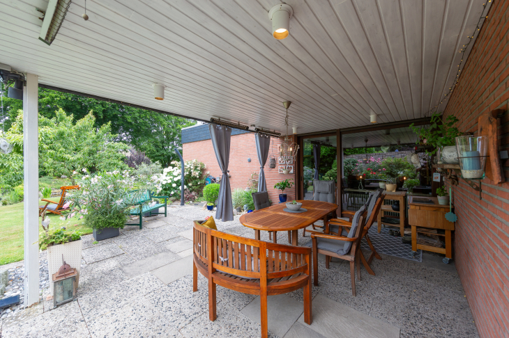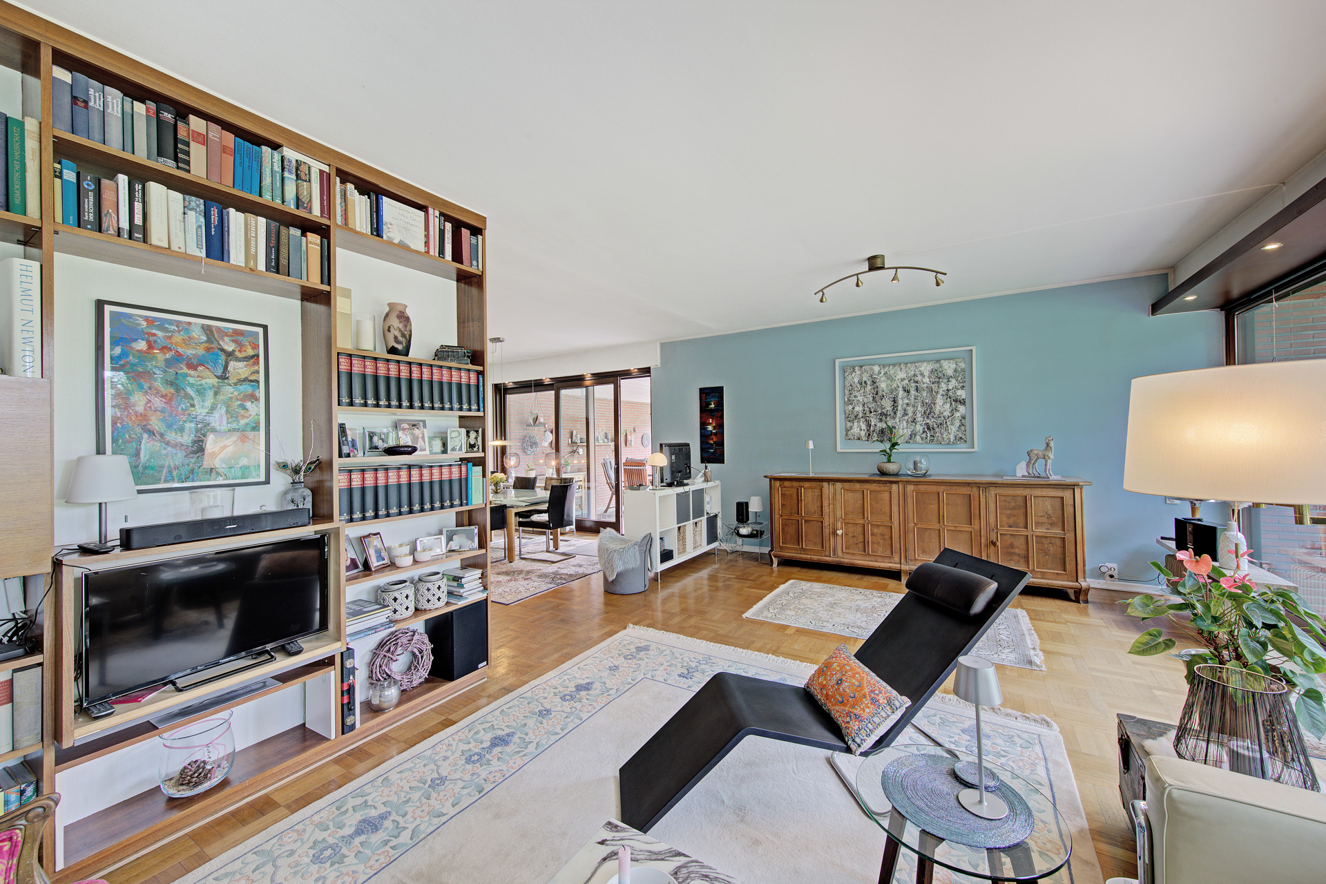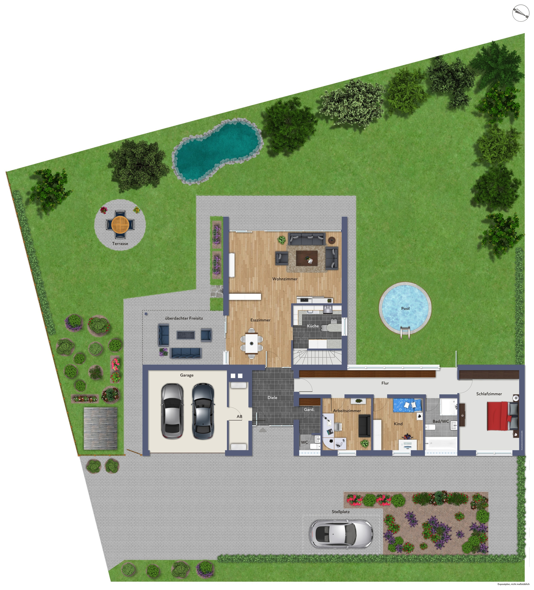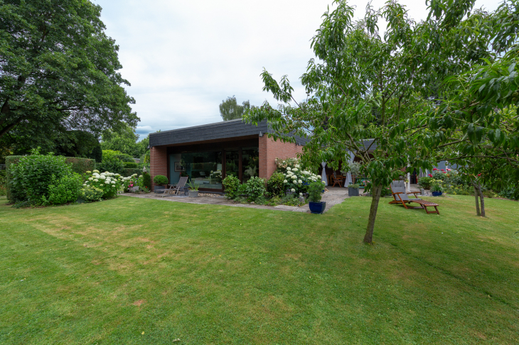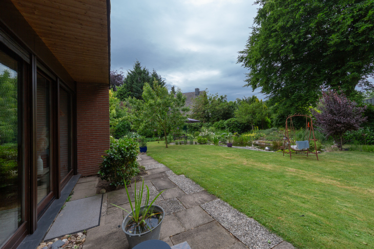Besonders eindrucksvoll ist der weitläufige Garten: Großzügige Rasenflächen, prächtiger Baumbestand, wertvolle Pflanzen und Gewächse sowie eine malerische Teichanlage schaffen eine grüne Oase, die zum Entspannen einlädt. Drei Terrassen für jeden Geschmack: Großzügig überdachte Speisenterrassen für die große Tafel, "grill and chill", die Frühstücksterrasse am Teich oder die breit ausgelegte Sonnenterrasse mit schönstem Parkblick und eine geschützte Süd-West-Ausrichtung machen den Außenbereich zum idealen Rückzugsort. Der Aufstellpool für Wellness oder Spiel und Spaß sowie ein hübsches Gartenhaus mit zusätzlichem Unterstand für Räder ergänzen das herrliche Gartenparadies.