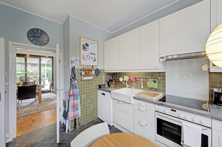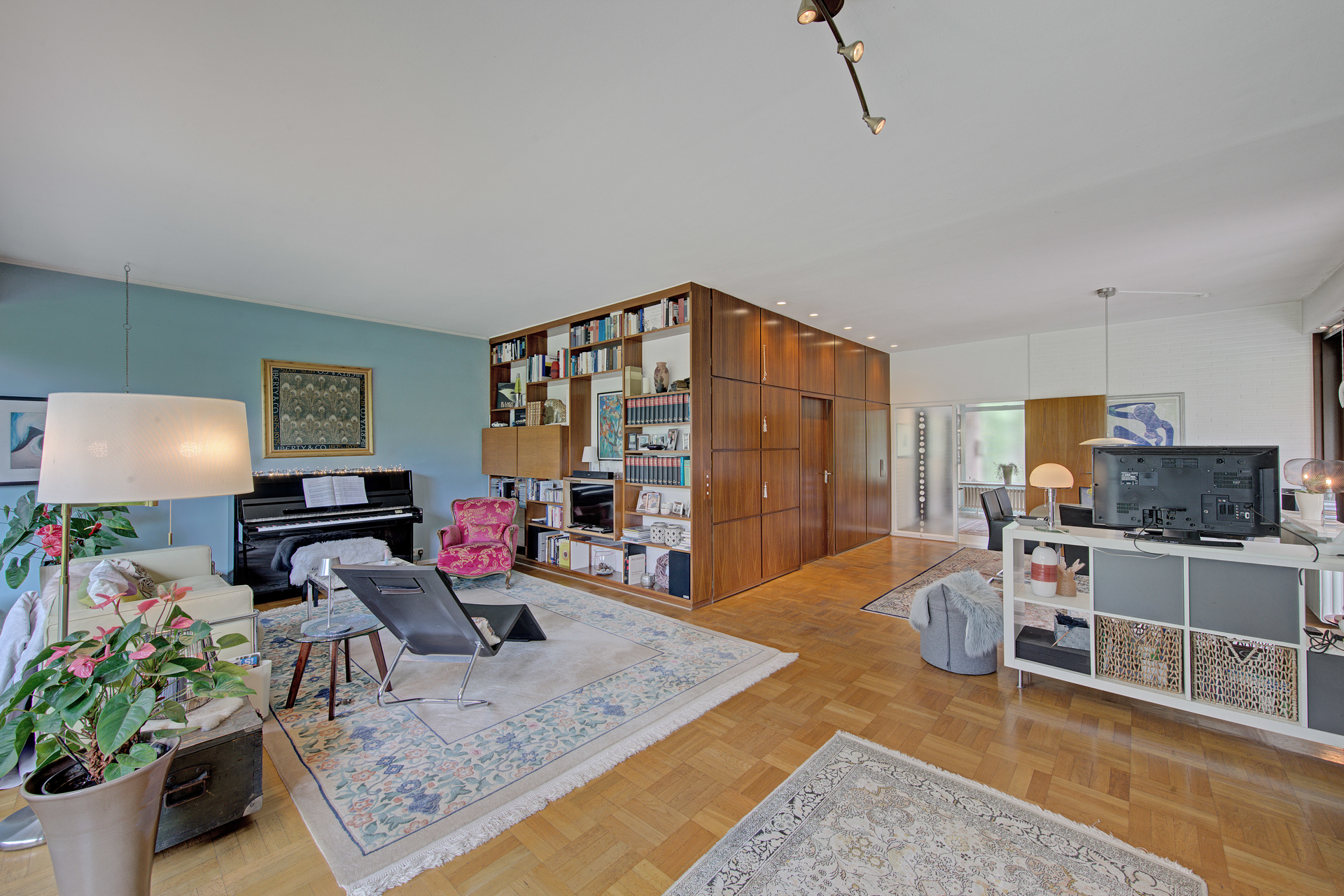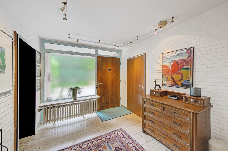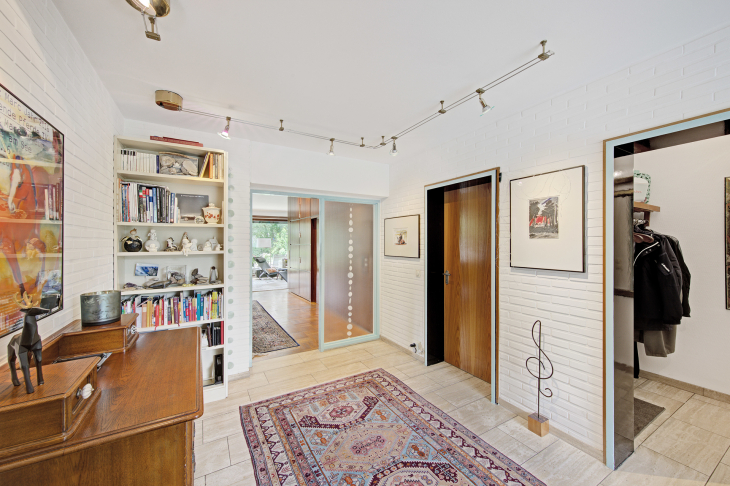 Die Innenausstattung maßgeblich mit original Stilementen, überzeugt mit ausgesuchten Materialien und viel Liebe zum Detail: Im Entrée liegt geschmackvoller Travertin Naturstein, während der großzügigen Wohnbereich durch edles Massivholzparkett ergänzt wird. Der separat gelegene Schlaftrakt verfügt über einen sogenannten praktischen Schrankflur mit orginaler Echtholzschrandwand von nahezu 9 Metern – so entsteht in den drei Zimmern und Badezimmer mehr Platz zur individuellen Verfügung. Ein besonderes Highlight sind die originalen Innentüren aus Olivesche oder die Einbauschränke aus edlem Palisanderholz im geräumigen Wohn-Esszimmer, die dem Haus eine unverwechselbare Note verleihen. Das Badezimmer wurde 1995 modernisiert und präsentiert sich in neutralem, zeitlosen Design.
