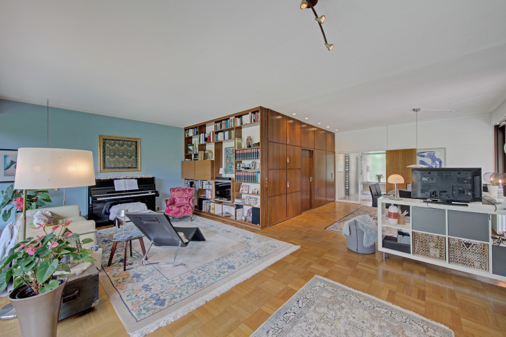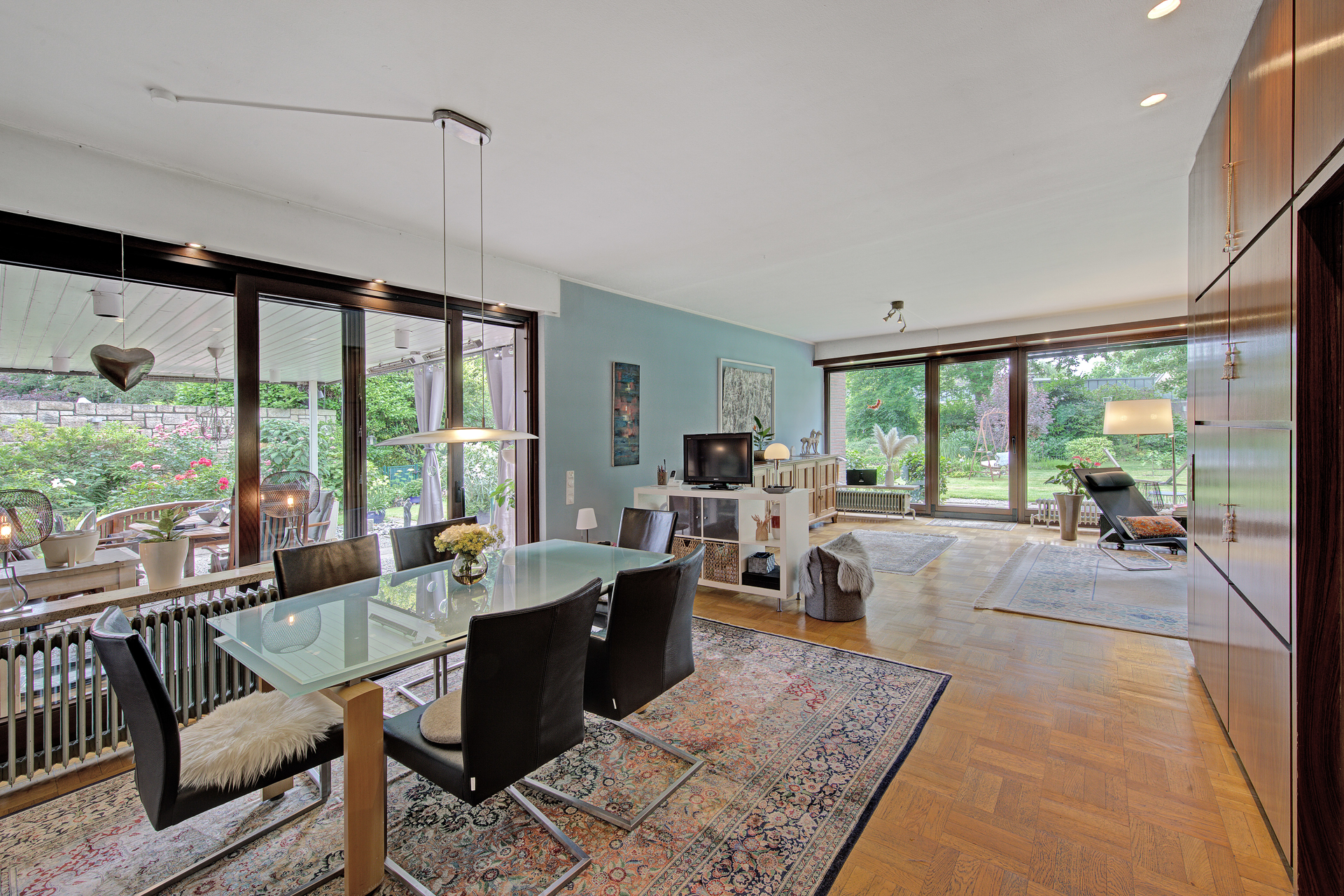 Der eingeschossige Baukörper verfügt über ca. 152 m² Wohnfläche sowie eine Teilunterkellerung von rund 64 m². Seit seiner Erbauung befindet sich das Haus in Familienbesitz und wurde kontinuierlich gepflegt, instandgehalten und modernisiert. So wurden um 1990 das Betondach und Teile der Fassade gedämmt, die hochwertigen Meranti-Holzfenster aus den 1980er-Jahren wurden erst 2023 mit modernem Doppelisolierglas ausgestattet. Eine moderne Ölheizung (2008) sowie eine Solaranlage auf dem Dach, als Unterstützung der Heizung und Warmwasseraufbereitung, runden die technische Ausstattung ab.