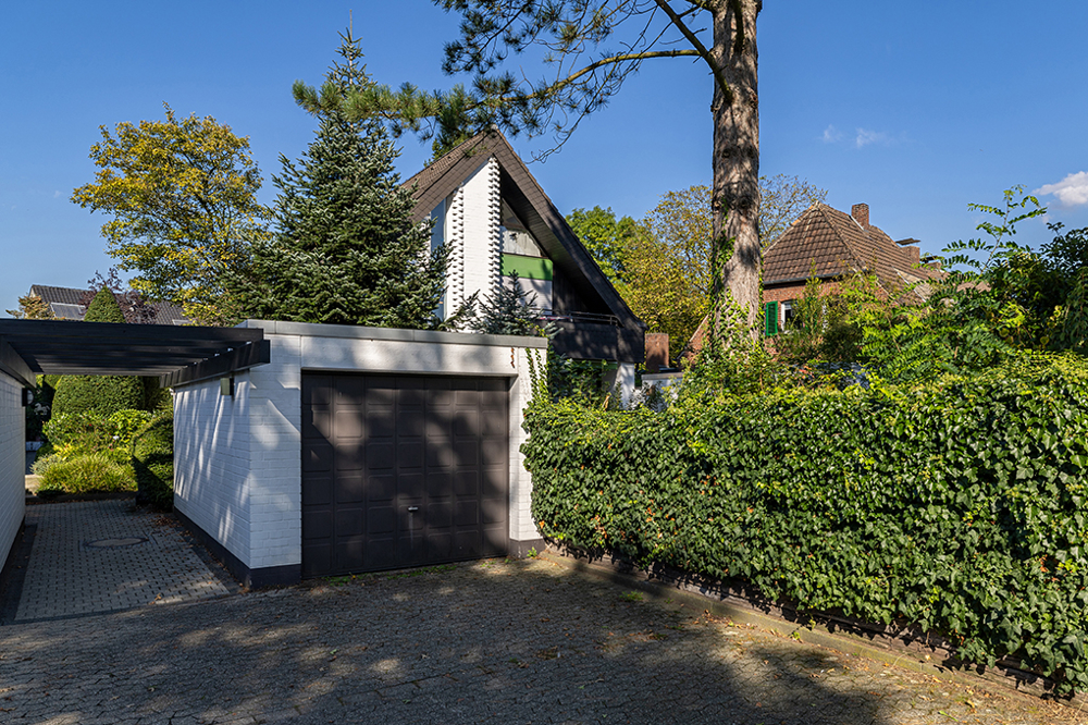 Die Immobilie fügt sich in eine Abfolge von zwei zueinander versetzten, halb freistehenden Einfamilienhäusern mit exklusivem Architekturstil ein. Eine klare Gestaltungslinie des Vorgartens mit separater Auffahrt und Zugang zum Haus ist nicht nur ansprechend, sondern verleiht der Lage des Hauses zusätzliche Privatsphäre.