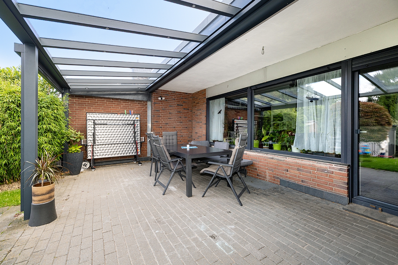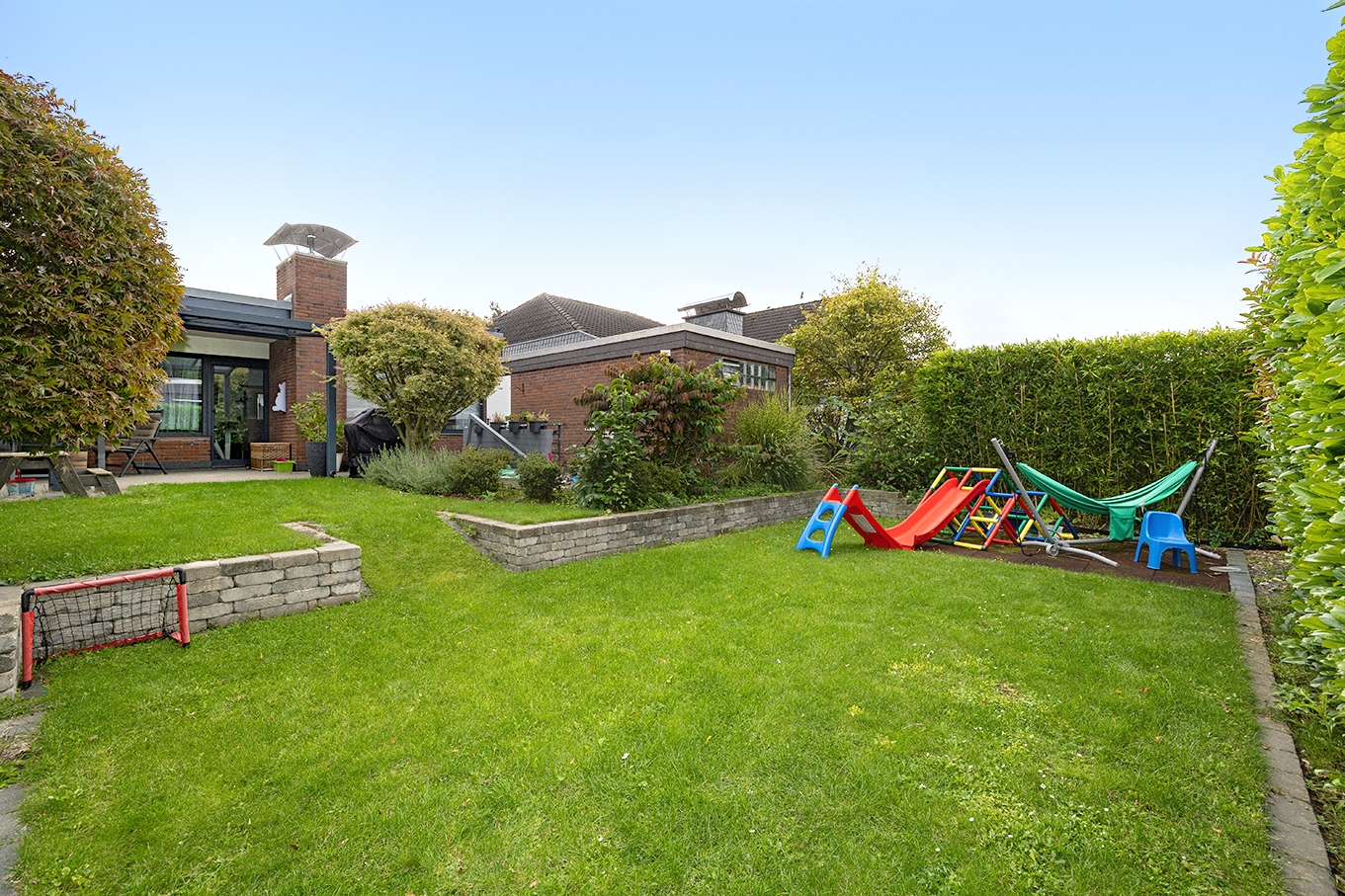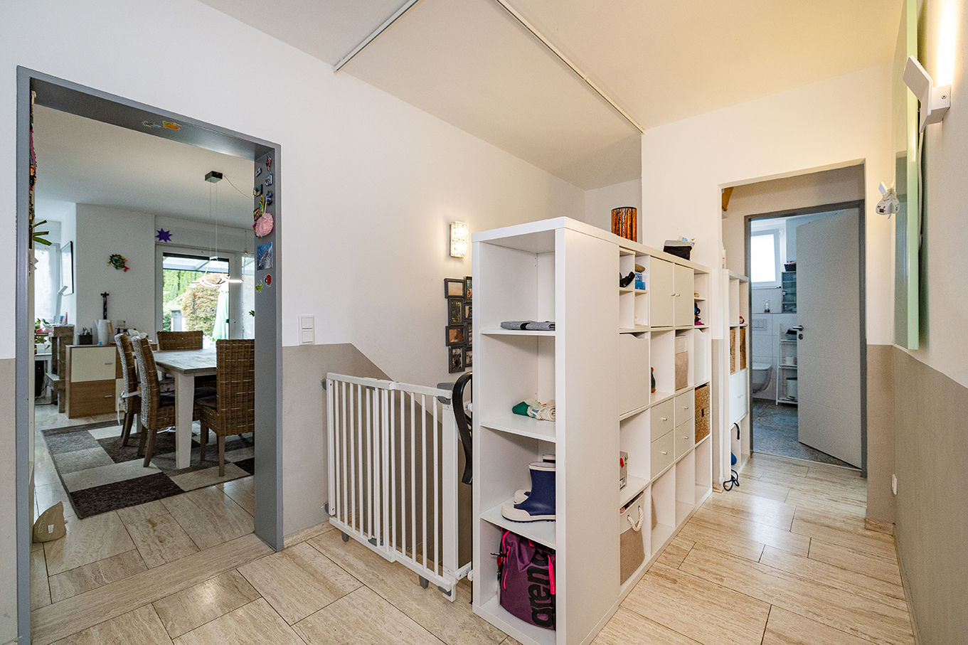 Auch der Außenbereich kann sich in Bezug auf Familie und Geselligkeit sehen lassen. Die weitläufige und glasüberdachte Terrasse mit elektrischer Verschattung erweitert den Wohnraum nach draußen und lädt zum Verweilen ein. Der Garten ist in zwei Ebenen als Splitlevel angelegt und bietet abwechslungsreiche Möglichkeiten - eine zusätzliche Terrasse, ein kleines Gerätehaus, einen Spielbereich mit Fallschutzplatten und pflegeleichte Grünflächen. Hier können Kinder unbeschwert spielen, Gäste feiern und Sie selbst entspannte Stunden genießen – ein echtes Highlight für Familien.