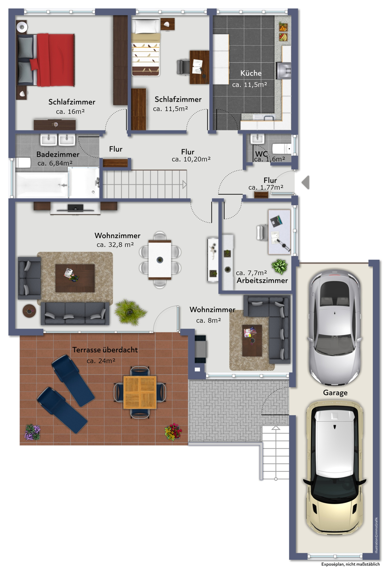 Praktische Pkw-Stellplätze vor dem Haus und der Garage sowie eine 9 Meter tiefe Garage mit Zugang zum Garten runden das Gesamtpaket ab.