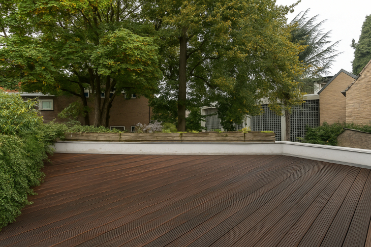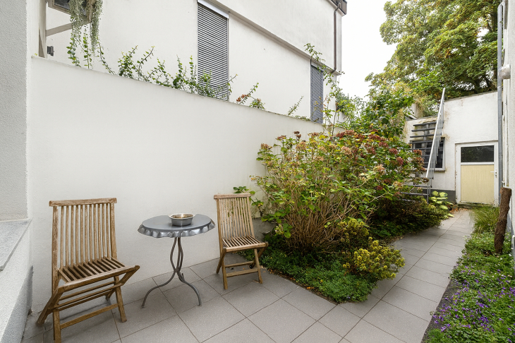 Im geschützten Innenhof eröffnet sich eine kleine grüne Oase – ein Ort der Ruhe und Privatsphäre mitten in der Stadt. Von hier führt eine Außentreppe hinauf auf die großzügige Dachterrasse im ersten Obergeschoss, belegt mit edlem Bankirai-Holz. Diese sonnige Terrasse ist ein echtes Highlight: privat, ruhig und perfekt für entspannte Stunden im Freien oder kleine Feste. Ein besonderer Vorteil in der Stadt: Eine kleine Garage steht ebenfalls zur Verfügung und ist direkt vom Innenhof zugänglich.