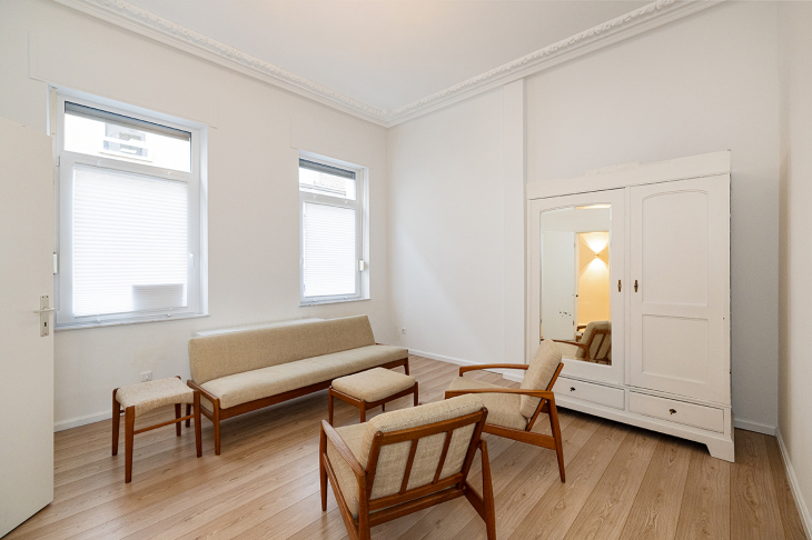 - Die vorderen Zimmer zur Straßenseite bestechen durch ihre hohen Decken, großen Doppelfenster und den geschmackvollen Bodenbelag in heller Holzoptik, der die historische Architektur wunderbar ergänzt. Besonders schön sind die noch original erhaltenen Holztüren und die feinen Stuckarbeiten der damaligen Zeit, die den authentischen Charakter dieser Etage bewahren.