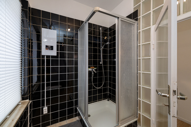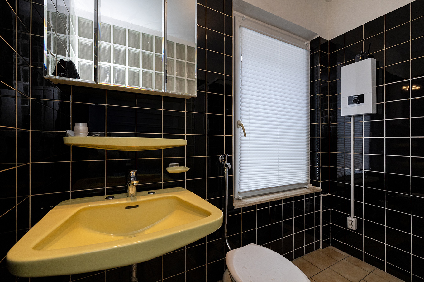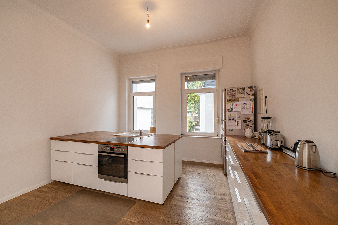 - Das originale Treppenhaus mit seiner hell lackierten Holztreppe und feinen Jugendstil-Details führt hinauf ins erste Obergeschoss. Über wenige Stufen erreicht man den hinteren, ruhigeren Bereich der Etage im Split-Level-Stil. Hier befindet sich die Ankleide sowie das authentisch erhaltene Badezimmer aus den 1950er-Jahren, mit markanten schwarzen Fliesen und charakteristischen gelb-beigen Keramiken. Im vorderen Teil des Hauses gelangt man zu einer modernen, offenen Küche mit angrenzendem Essbereich – der kommunikative Mittelpunkt des Hauses. Klare Linien, warme Holzoberflächen und großzügige Fenster verleihen diesem Bereich eine lichte, freundliche Ausstrahlung. Durch den offenen Übergang entsteht ein fließendes Raumgefühl, das von hoher Wohnqualität zeugt.