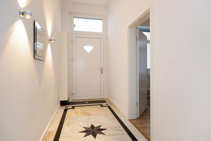 - Im Erdgeschoss empfängt ein stilvoller Eingangsbereich mit Marmor-Mosaikboden und feiner Sternintarsie – eine Reminiszenz an die Grandezza vergangener Zeiten. Klassische Stuckdecken, elegante Wandbeleuchtung und harmonische Wandfarben schaffen eine Atmosphäre von Wärme und Stil.