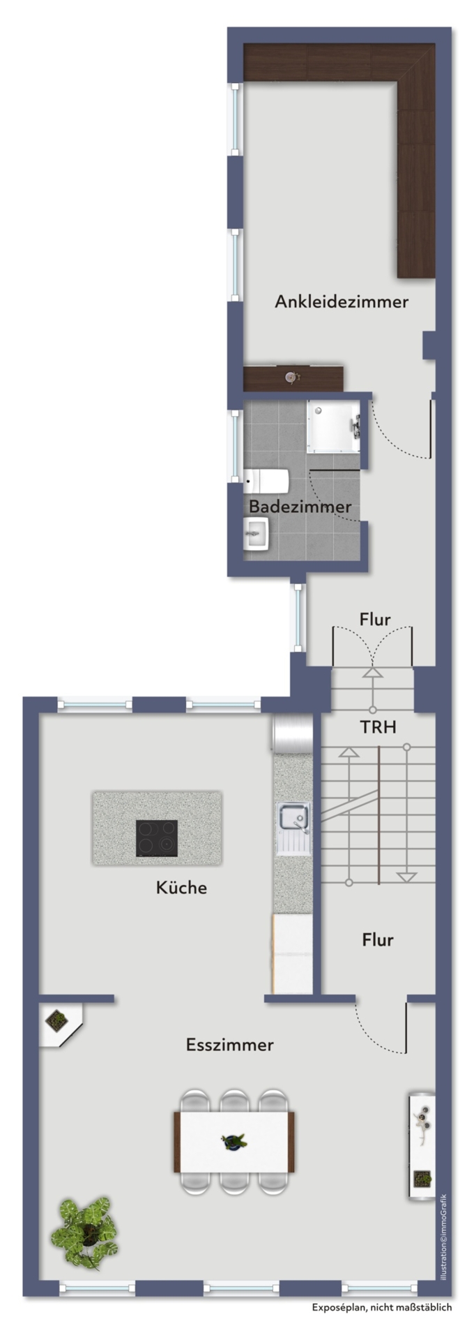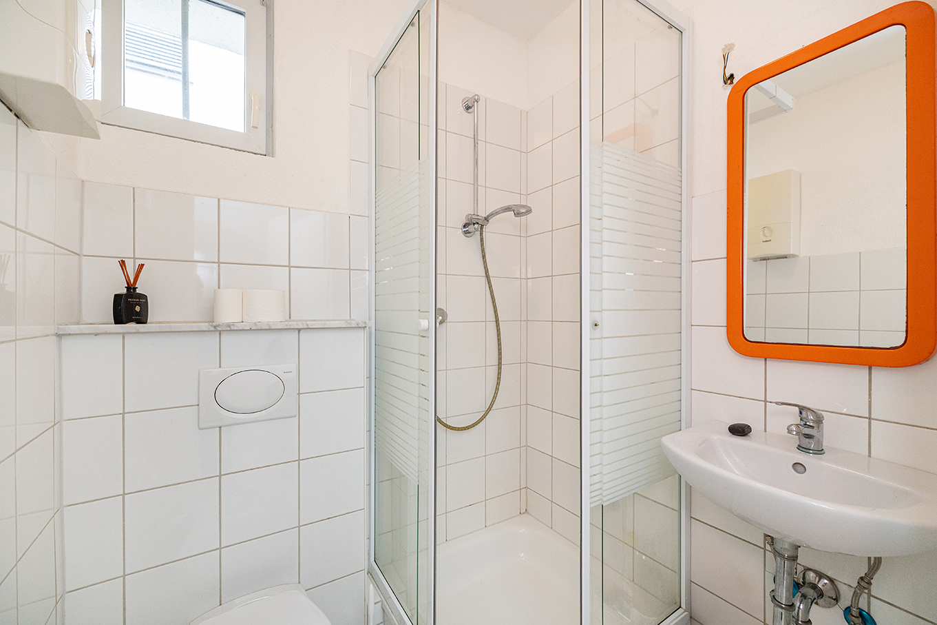 Im Erdgeschoss bietet das Stadthaus zudem flexible Nutzungsmöglichkeiten: Neben den repräsentativen Räumen zur Straßenseite, die sich ideal als Homeoffice oder Bürofläche eignen, befindet sich im hinteren Anbau ein separater Bereich mit Duschbad und Anschluss für eine kleine Kitchenette. Diese Einheit kann bei Bedarf als kleines Einliegerapartment oder Gästebereich genutzt werden. Ein praktisches Plus für Wohnen und Arbeiten unter einem Dach.