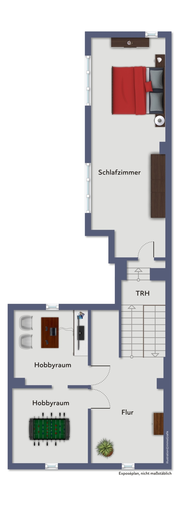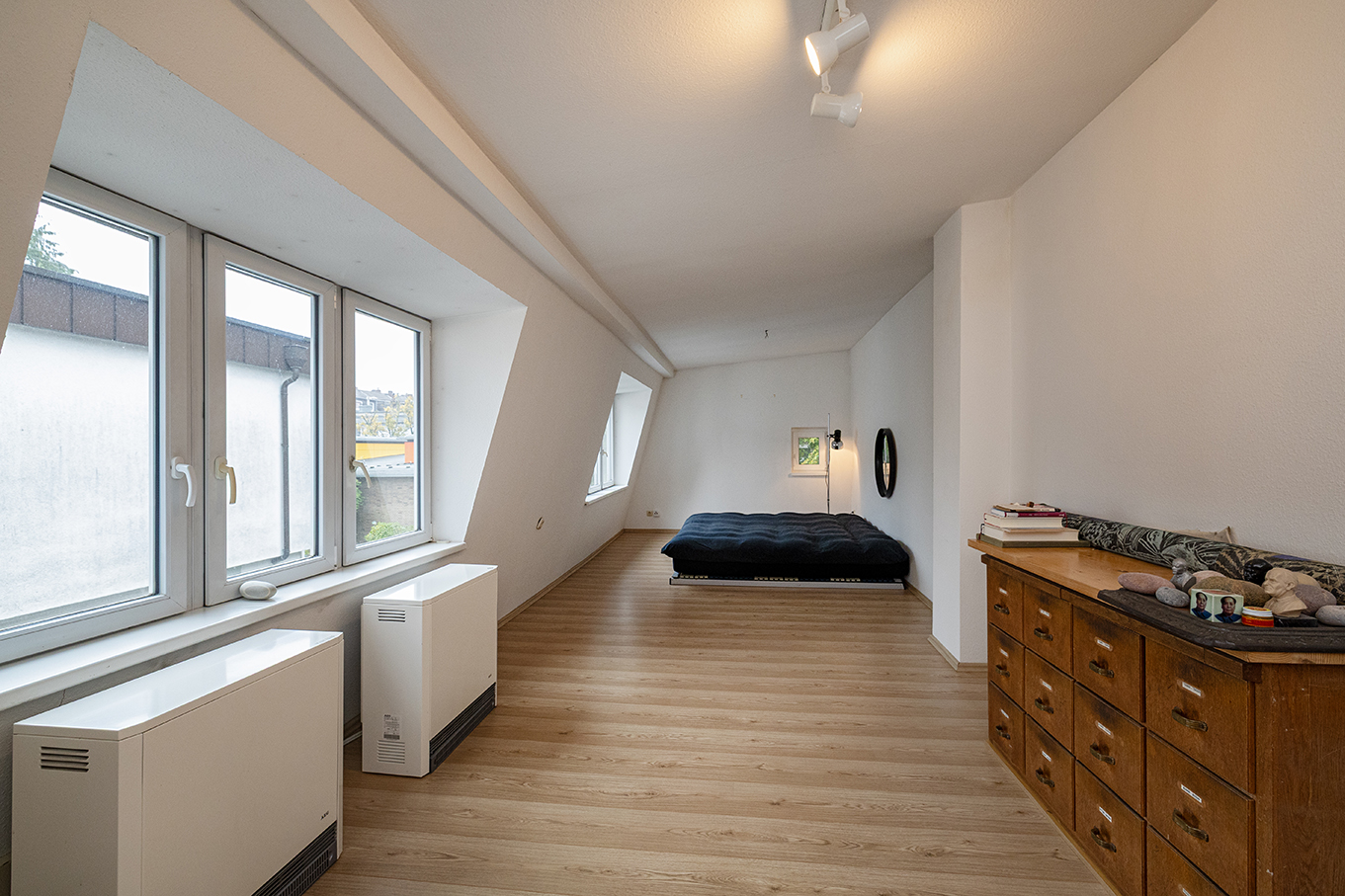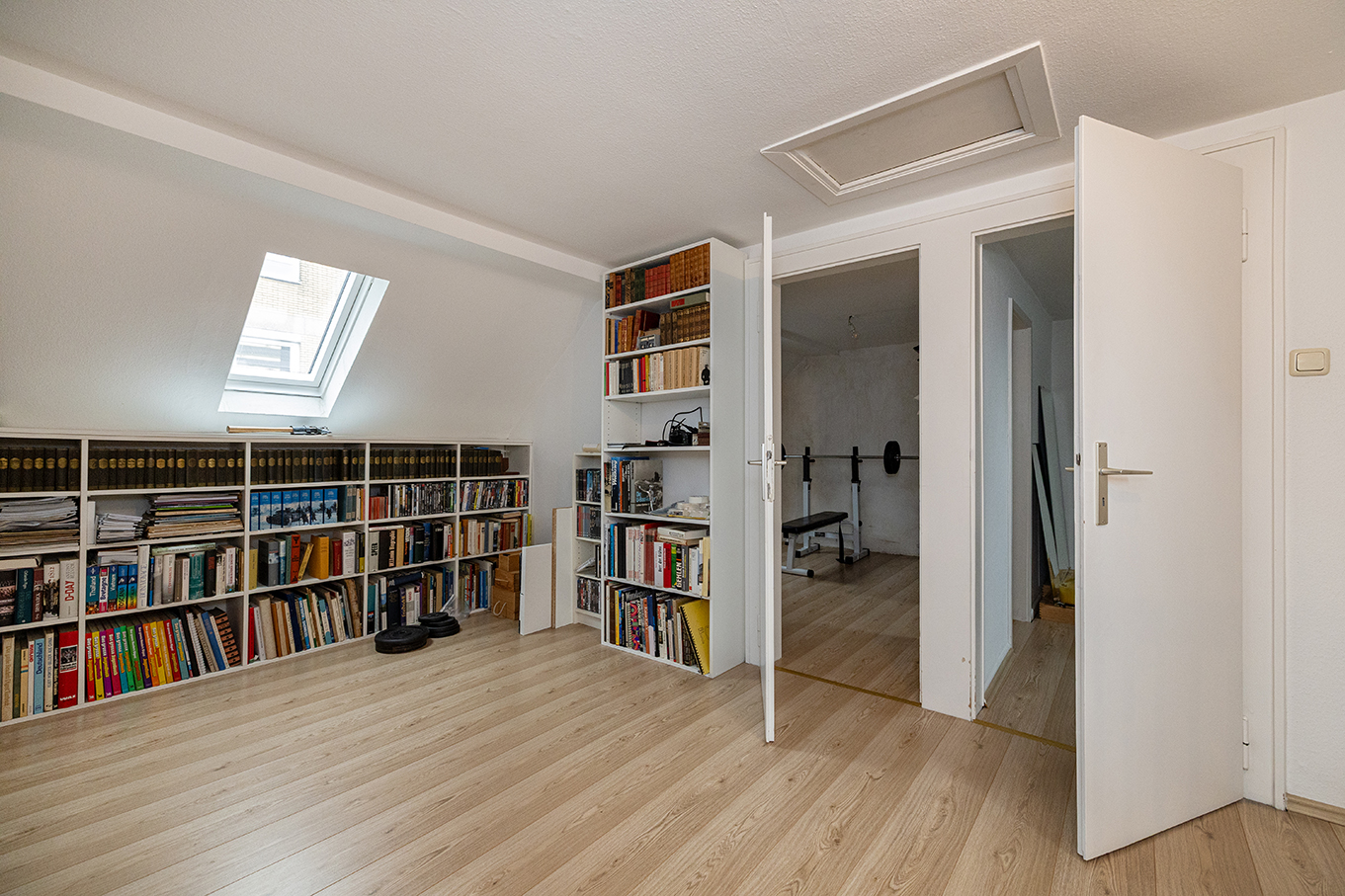 - Das ausgebaute Dachgeschoss ergänzt das Raumangebot um zwei weitere Zimmer, die sich ideal als Kinder-, Gästeoder Arbeitsräume eignen. Helle Wandflächen, sichtbare Dachschrägen und großzügige Dachflächenfenster schaffen eine luftige, freundliche Atmosphäre. Ein zentraler Raum wird aktuell als kleine Bibliothek genutzt.