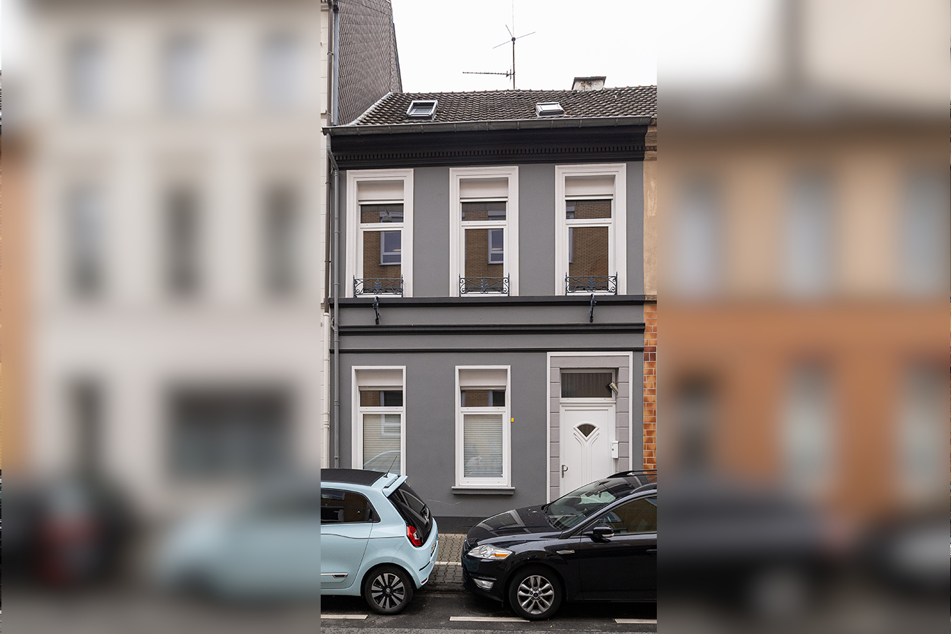 Dieses wunderschöne Stadthaus, errichtet um 1910–1915, liegt im Herzen Krefelds – in direkter Nähe zur Dionysiuskirche. Seine Fassade vereint den Charme der Jugendstilzeit mit einer zeitlos modernen Farbgebung: klassisch proportionierte Fensterachsen, fein modellierte Rahmungen und weiße Gesimse verleihen dem Gebäude eine elegante, ruhige Struktur. Der Farbkontrast aus anthrazitgrauer Hauptfläche und weißen Fensterrahmungen unterstreicht die Architektur subtil, ohne den historischen Charakter zu verfälschen – ein gelungenes Beispiel für die behutsame Stadthaussanierung im urbanen Kontext.