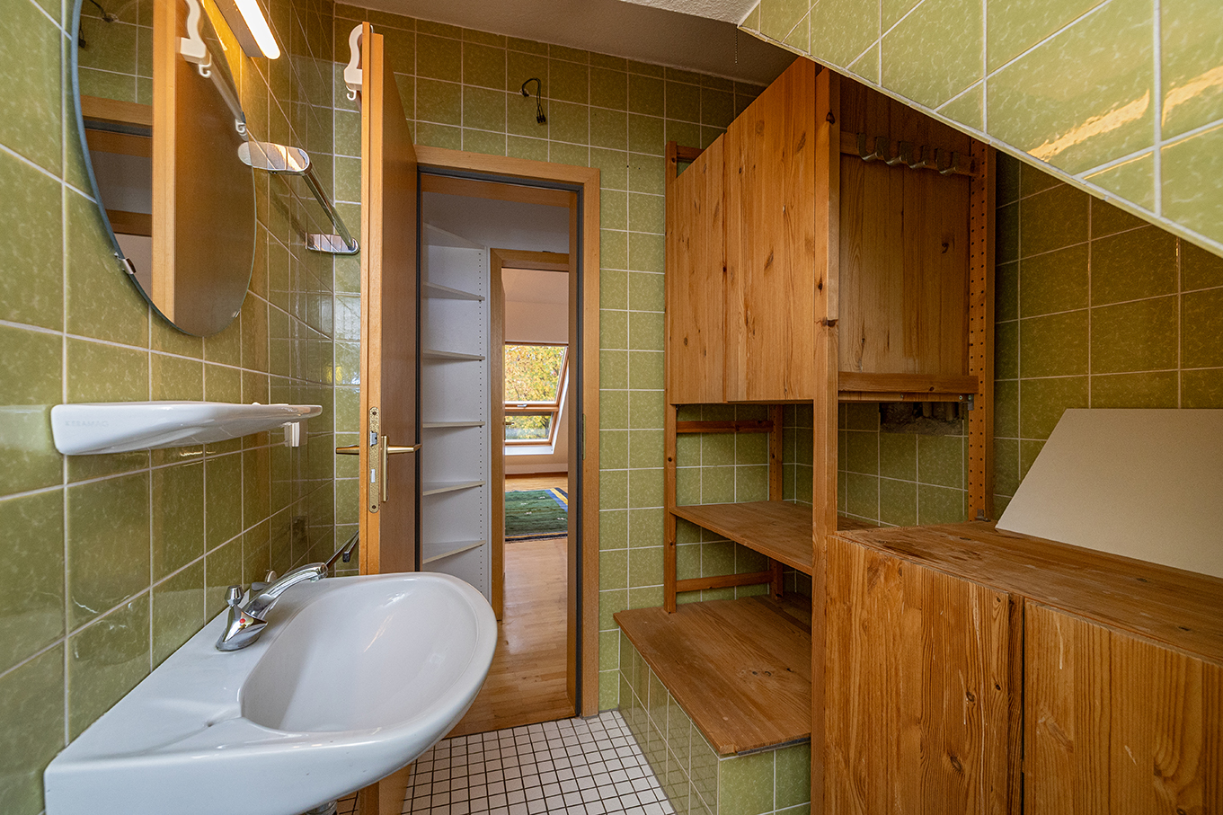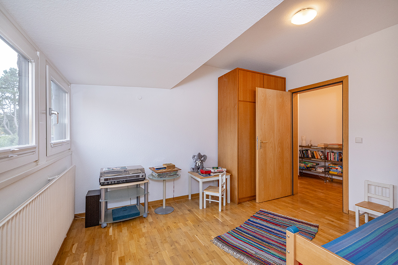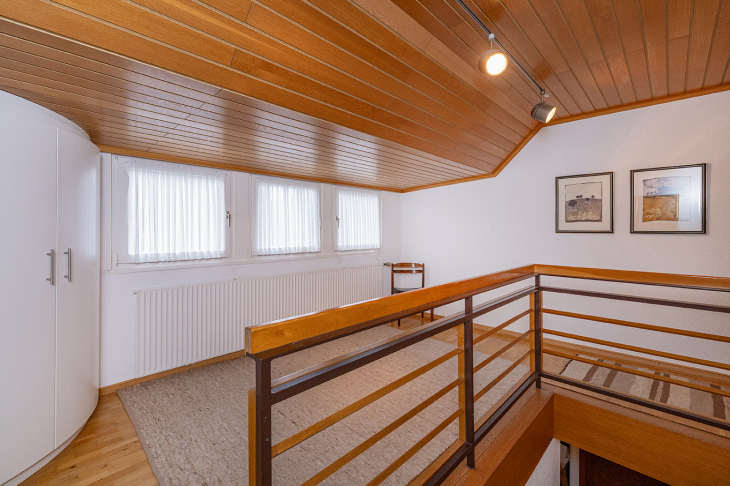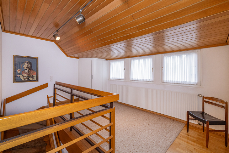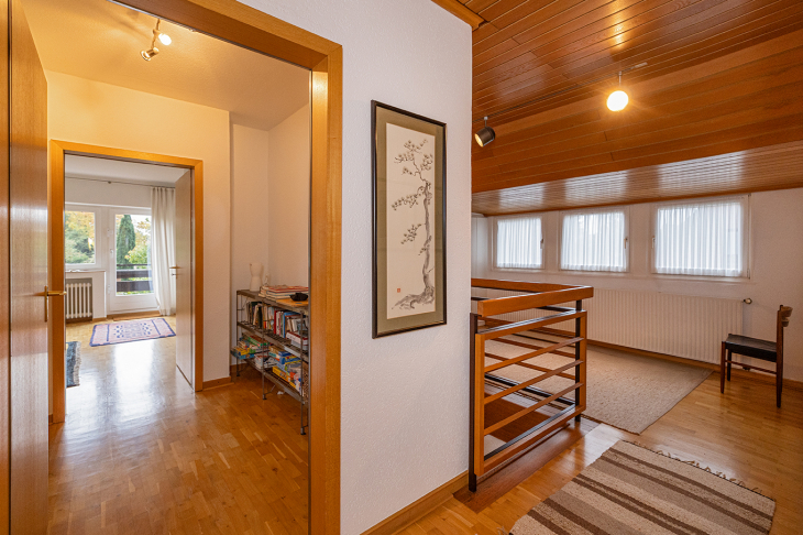 Das großzügige Obergeschoss eröffnet weitere attraktive Wohnmöglichkeiten. Über die offene Galerie mit praktischem Einbauschrank gelangt man in ein lichtdurchflutetes Wohnzimmer mit großem Giebelfenster und Westbalkon sowie separater Küche. Zudem drei geräumige Schlafzimmer, teilweise mit Einbauschränken. Ein modernisiertes Duschbad steht ebenfalls zur Verfügung. Ein weiteres Bad, aktuell als Abstellraum genutzt, lässt sich bei Bedarf reaktivieren.