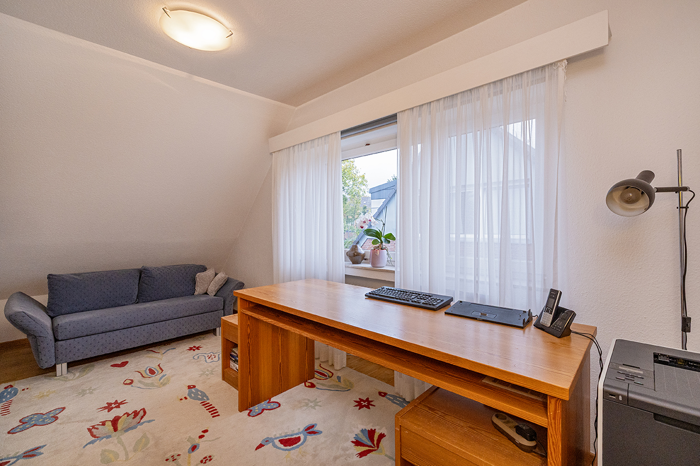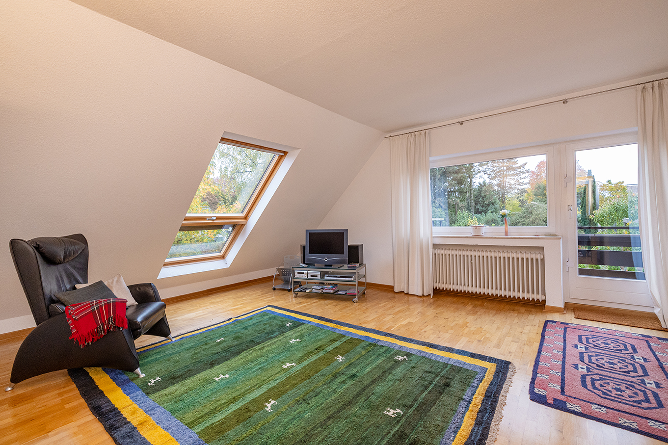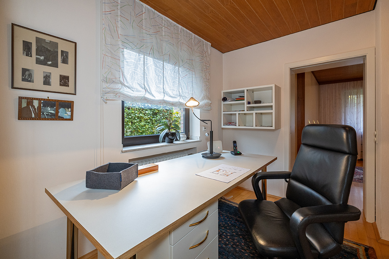Das großzügige Obergeschoss eröffnet weitere attraktive Wohnmöglichkeiten. Über die offene Galerie mit praktischem Einbauschrank gelangt man in ein lichtdurchflutetes Wohnzimmer mit großem Giebelfenster und Westbalkon sowie separater Küche. Zudem drei geräumige Schlafzimmer, teilweise mit Einbauschränken. Ein modernisiertes Duschbad steht ebenfalls zur Verfügung. Ein weiteres Bad, aktuell als Abstellraum genutzt, lässt sich bei Bedarf reaktivieren.