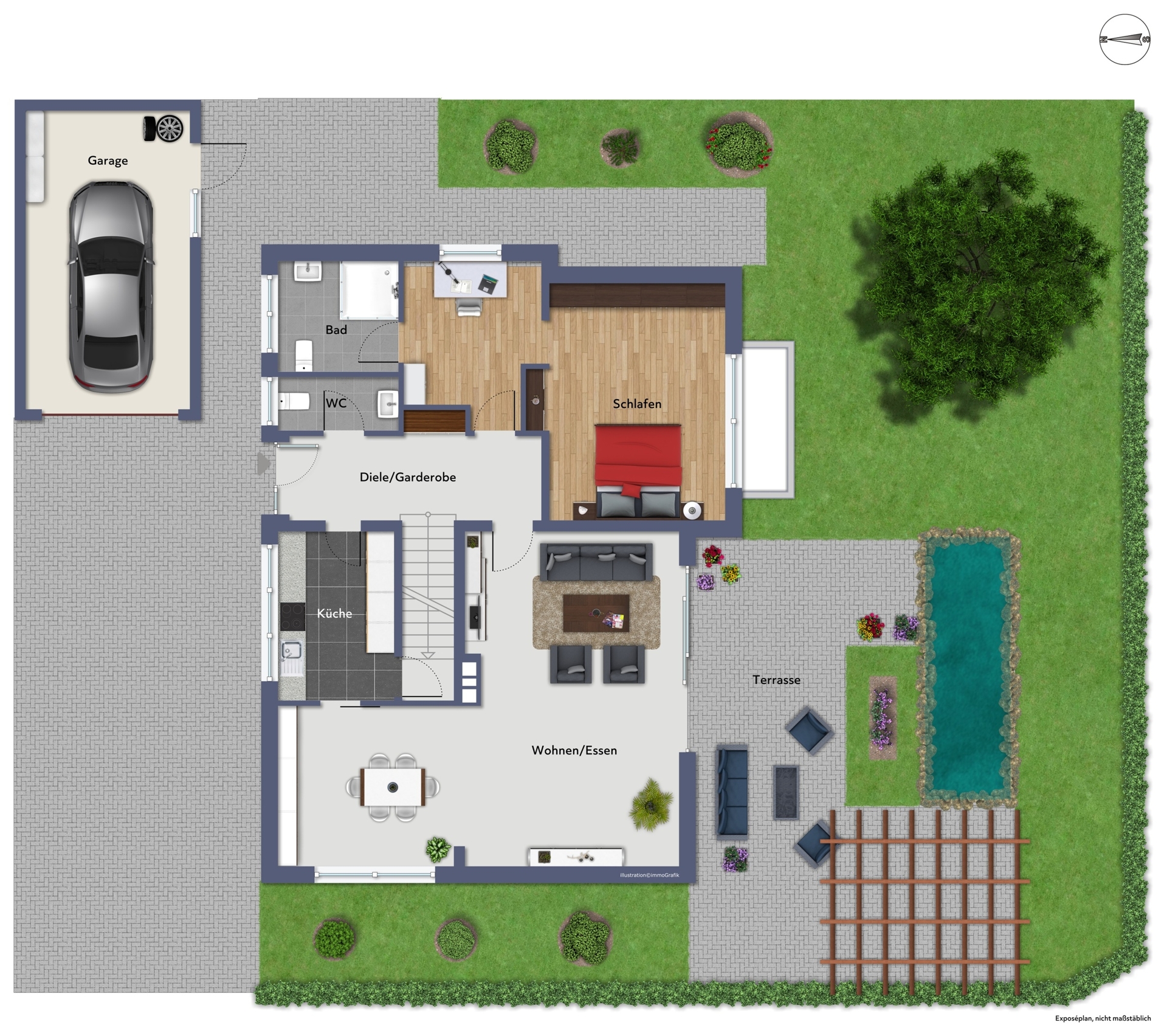 Der in vollständig eingefriedete Garten ist liebevoll angelegt, mit großer Sonnenterrasse, Pergola und kleiner Teichanlage, und profitiert von einer idealen Süd- und Westausrichtung. Eine übergroße Einzelgarage ergänzt das Gesamtbild.
