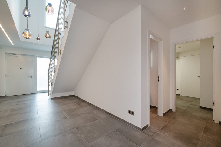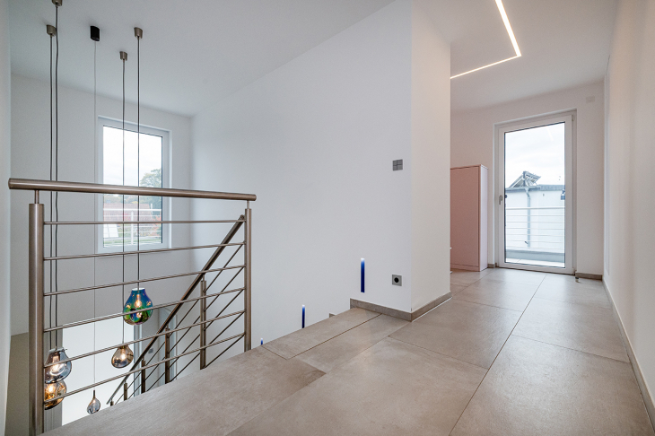 Schon beim Betreten des Hauses entfaltet sich ein Gefühl von Weite und architektonischer Präzision. Das Entrée empfängt mit klarer Formensprache, raumhoher Verglasung und einem harmonischen Spiel aus Licht, Material und Perspektive. Eine moderne Designerleuchte setzt über der Treppe ein schwebendes Statement, während die offene Galerie dem Haus seine charakteristische Großzügigkeit verleiht.