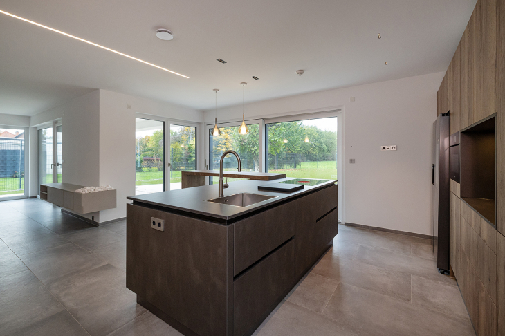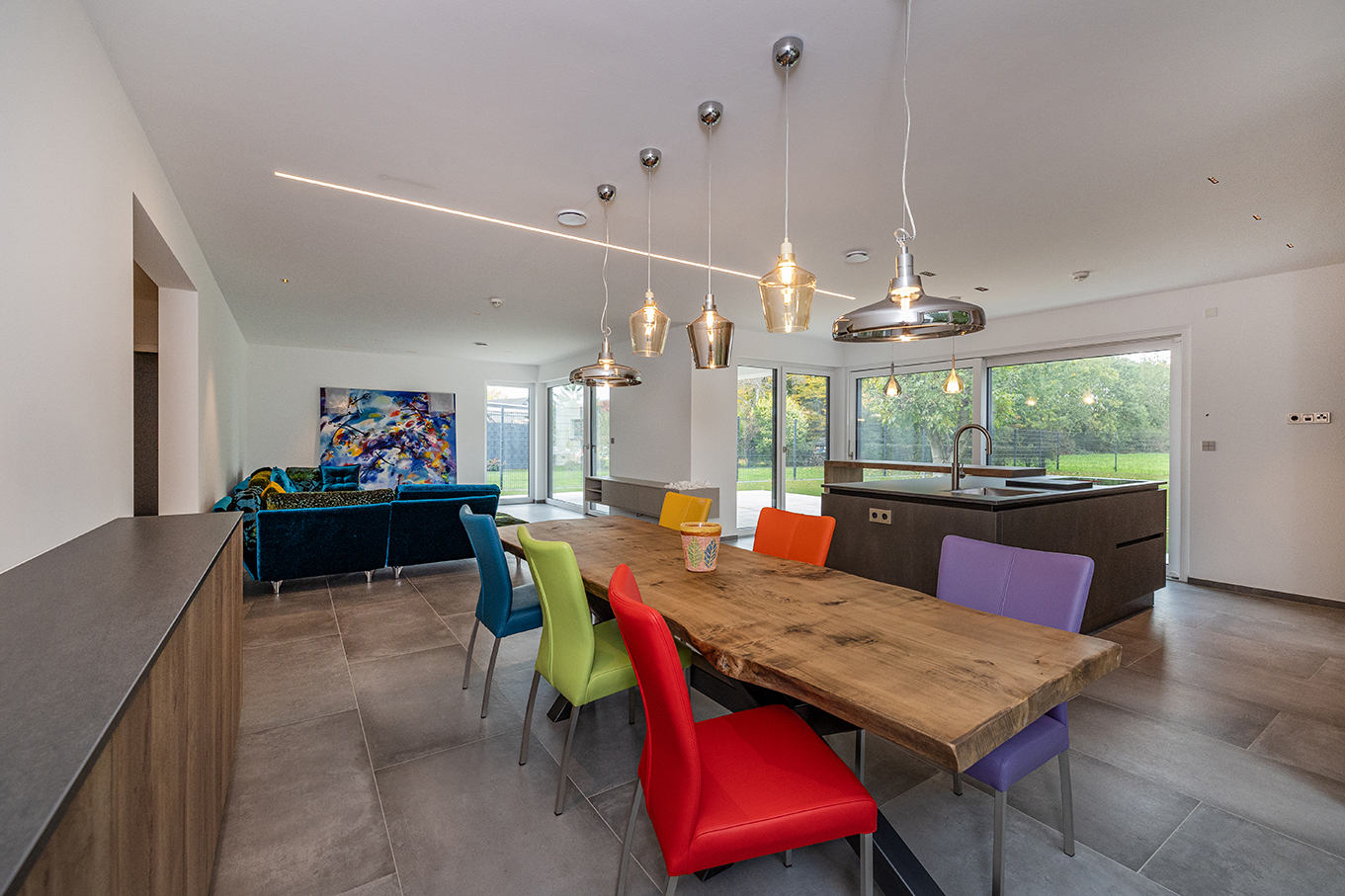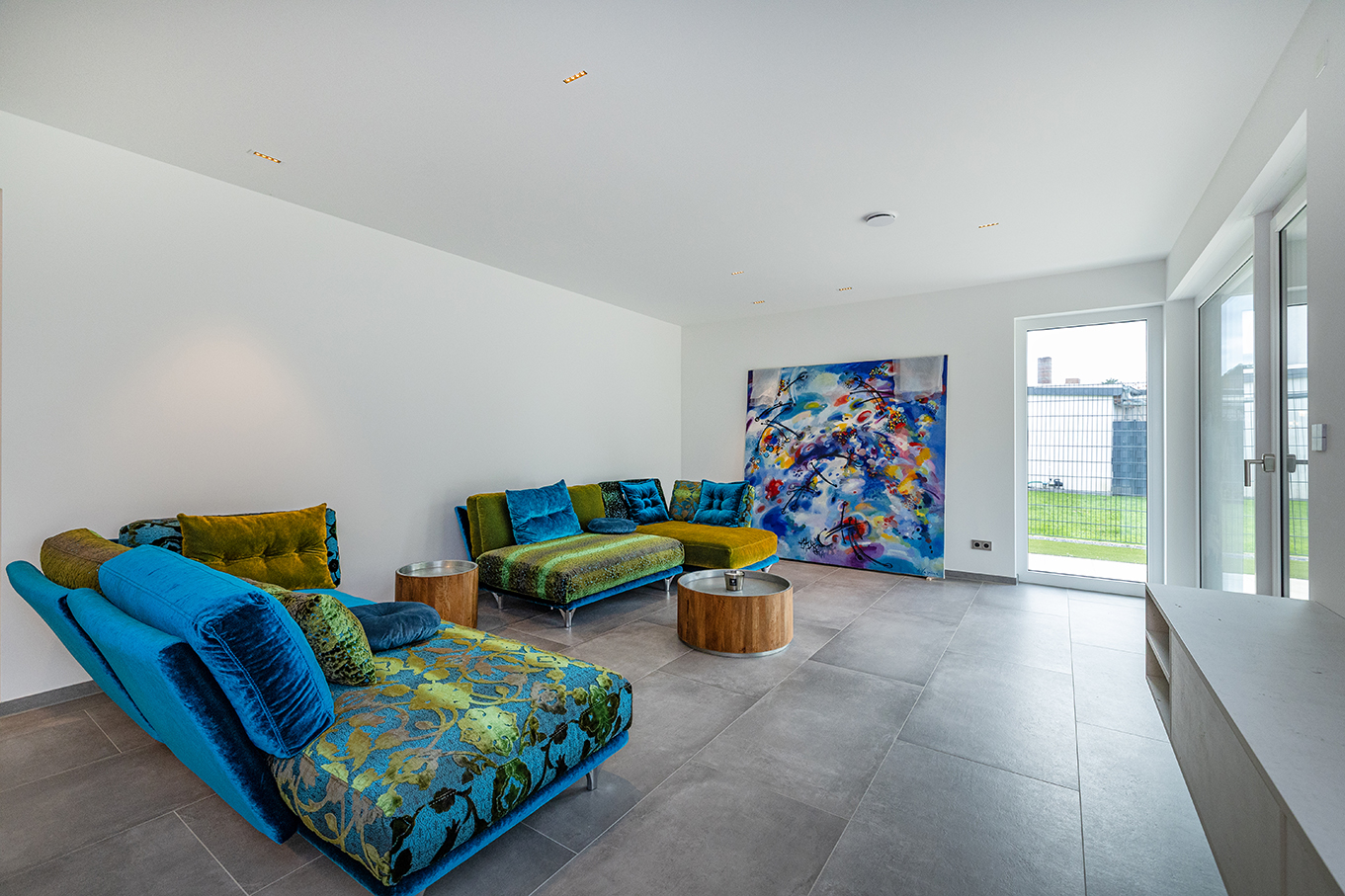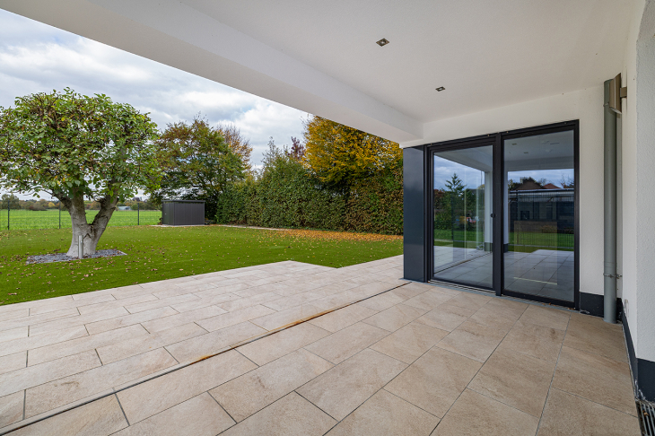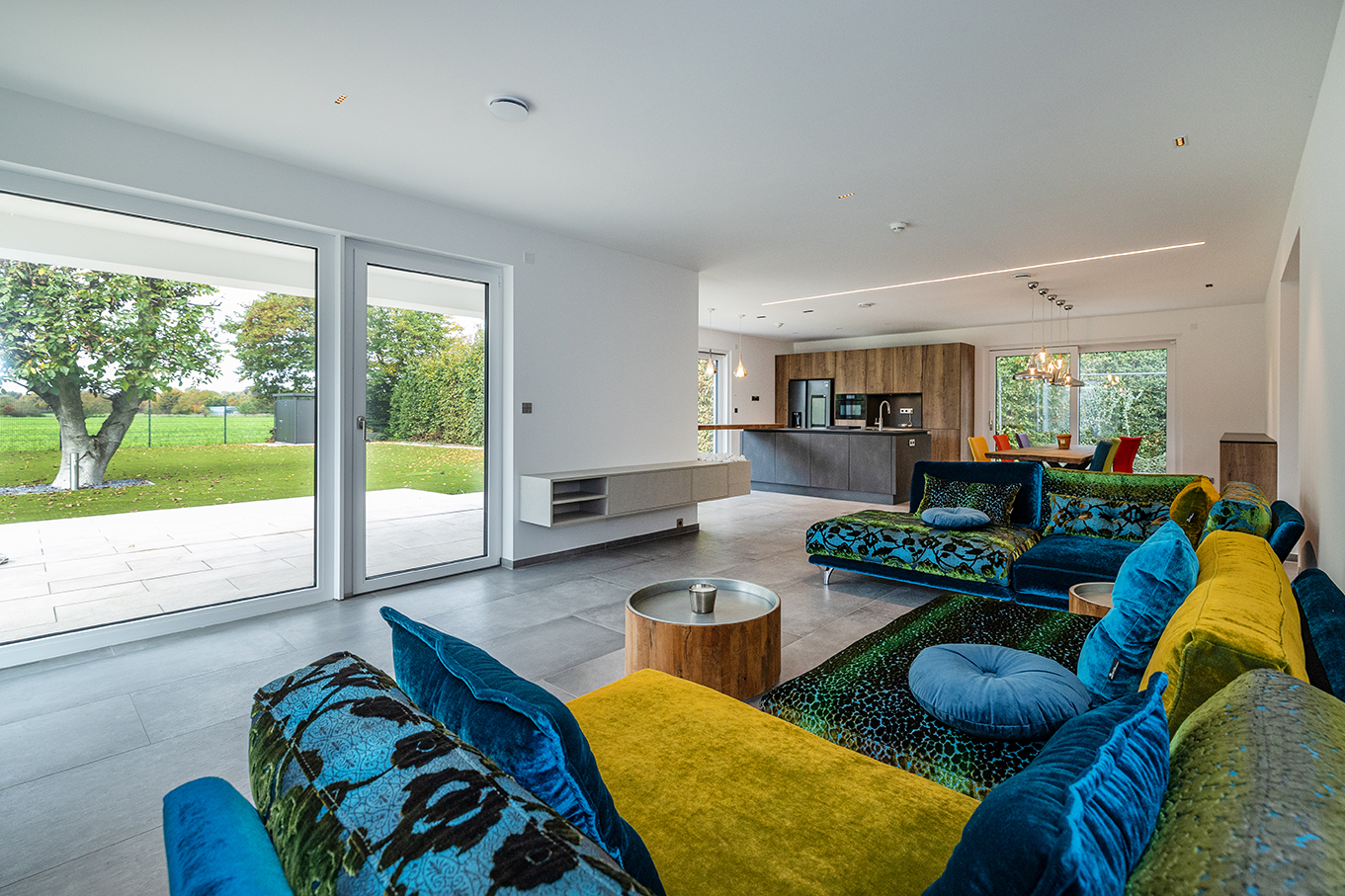 - Der Wohnbereich öffnet sich zum Garten hin und vermittelt durch seine fließenden Raumübergänge ein außergewöhnliches Raumgefühl – zeitlos, ruhig und von einem subtilen Luxus geprägt.