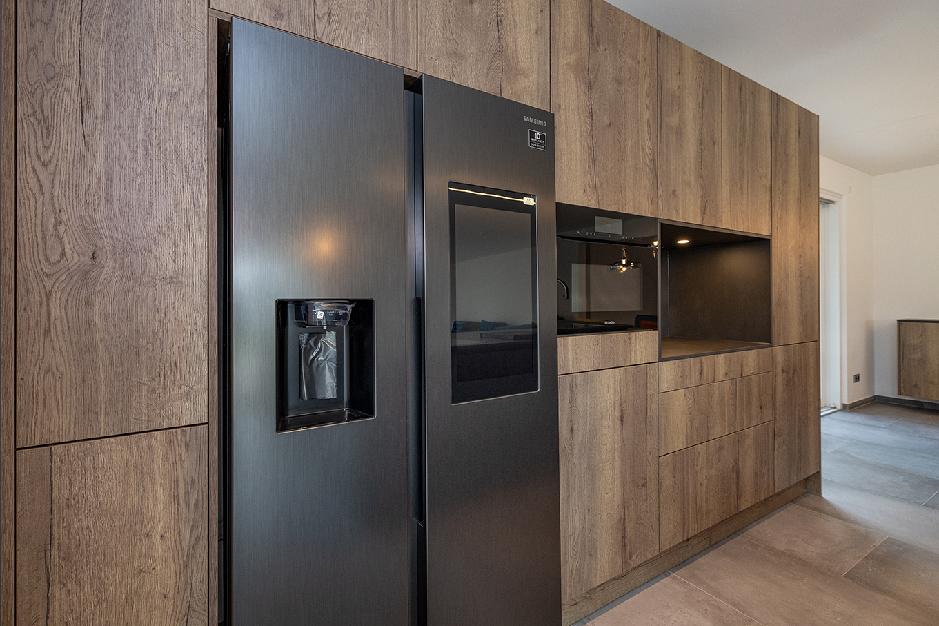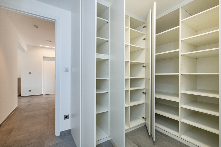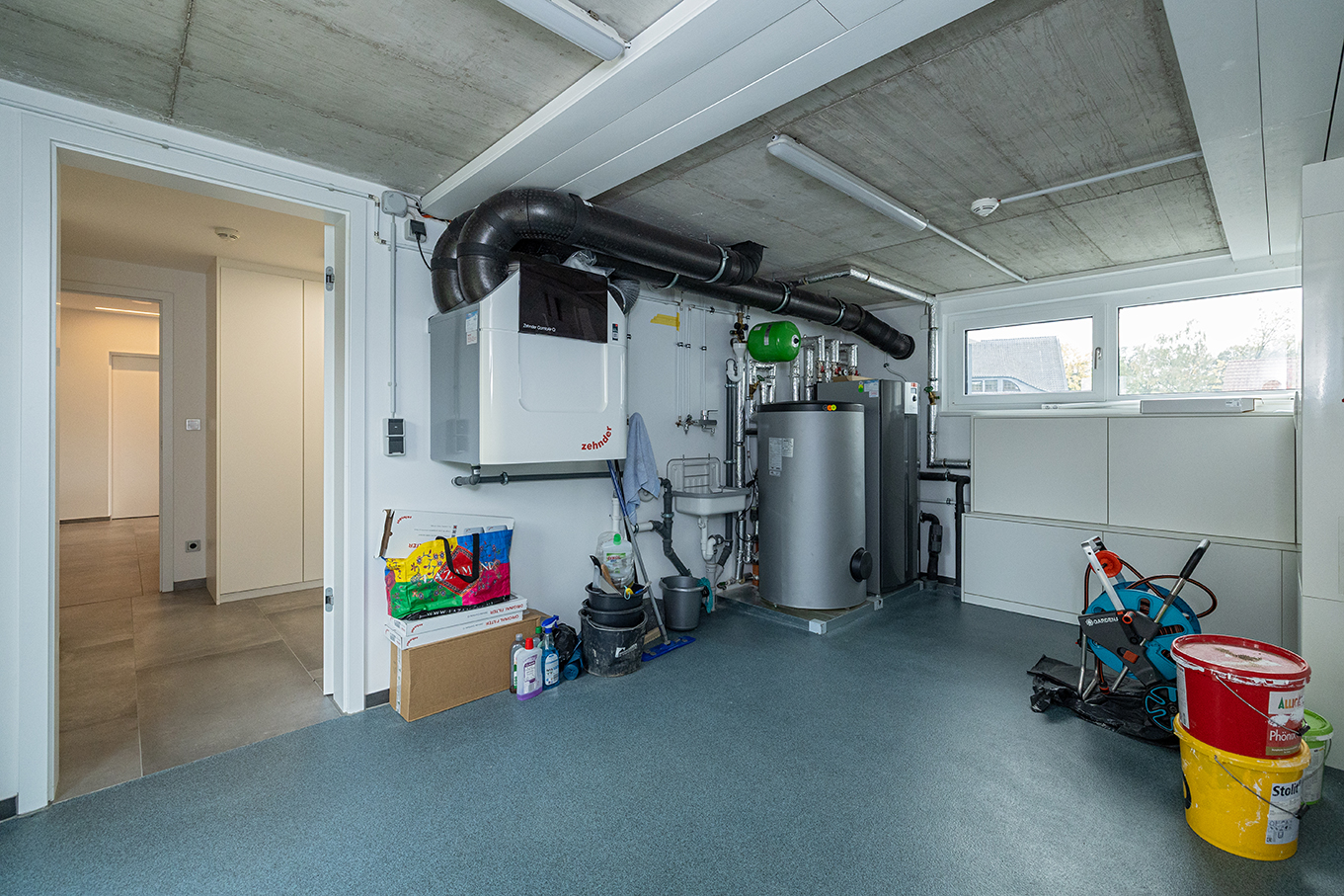 - Ergänzt wird das Erdgeschoss durch einen Hauswirtschaftsraum, der mit maßgefertigten, deckenhohen Einbauschränken ausgestattet wurde. Hier verbinden sich Ästhetik und Funktion auf ideale Weise – alles hat seinen Platz, und dennoch bleibt die architektonische Ruhe des Hauses gewahrt. Ein direkter Zugang zur großräumigen Doppelgarage sorgt für maximale Alltagstauglichkeit.