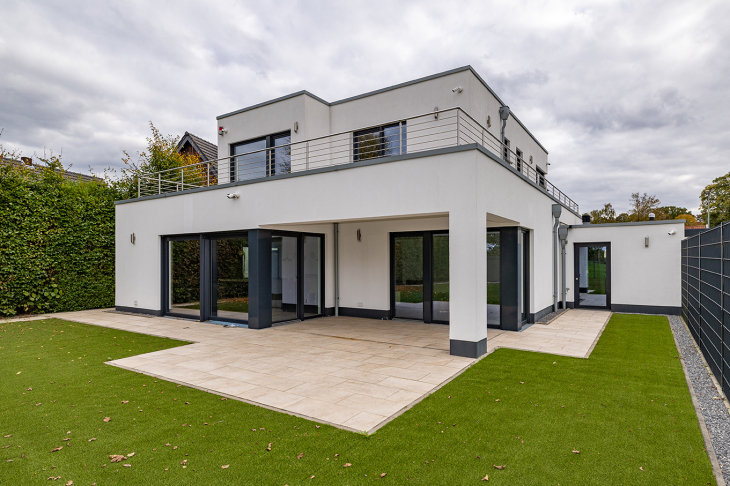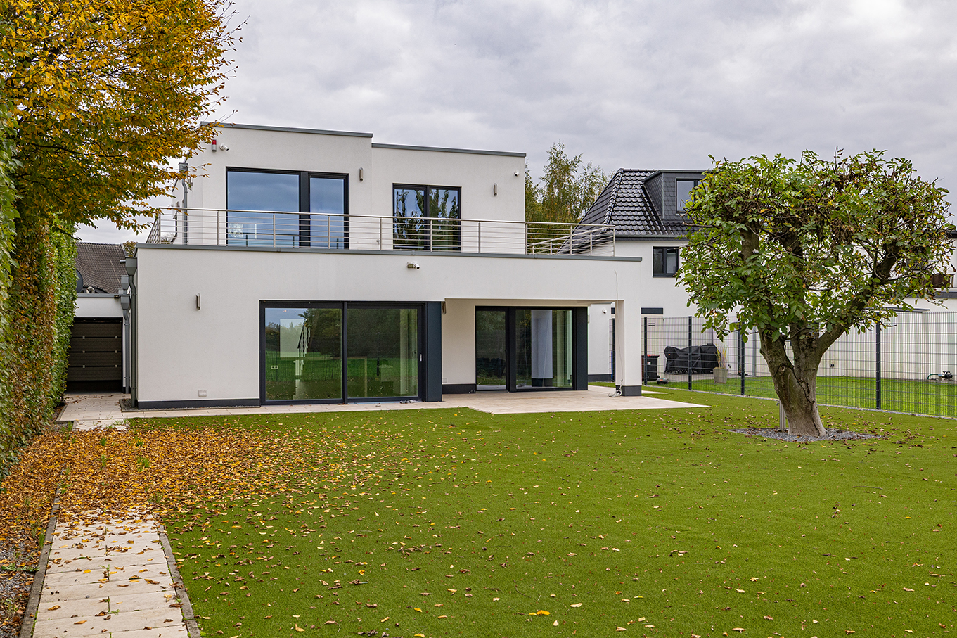 Eine klare Architektursprache, eingebettet in grüne Weite – diese Villa im begehrten Krefelder Ortsteil Verberg verbindet puristisches Design mit einem außergewöhnlichen Gefühl von Freiheit. Schon beim ersten Blick offenbart sich die kompromisslose Geradlinigkeit der Bauhaus-inspirierten Architektur: Flachdach, kubische Formen, großzügige Verglasungen und eine harmonische Balance aus Weiß, Anthrazit und Glas schaffen ein modernes Wohnstatement von beeindruckender Eleganz.