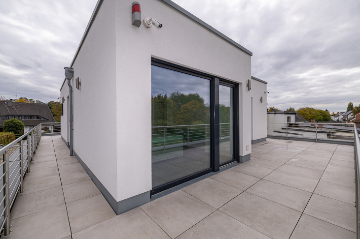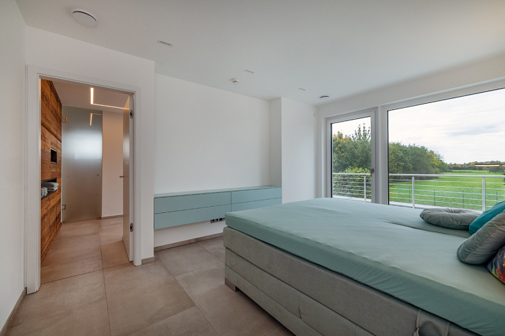 - Das Herzstück dieser Ebene ist das großzügige Schlafzimmer mit direktem Zugang zur weitläufigen Dachterrasse – ein Platz, an dem der Horizont förmlich in das Haus hineinreicht. Die klare Linienführung, der harmonische Farbkanon und der morgendliche Blick in die Natur verleihen diesem Raum eine außergewöhnliche Atmosphäre von Leichtigkeit und Weite.