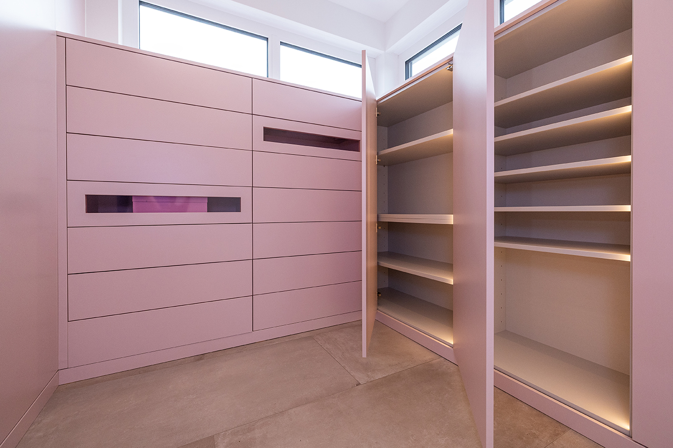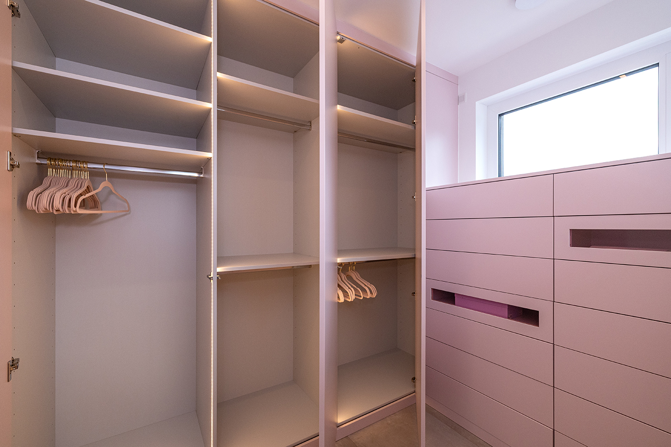 - Zwei separate Ankleidezimmer – individuell gestaltet für Sie und Ihn – bieten Raum für Organisation, Stil und Persönlichkeit. Die elegante Herren-Ankleide überzeugt durch klare Linien, Glasfronten und eine geradlinige Ordnung, während die Damen-Ankleide mit sanften Farbnuancen und maßgefertigten Einbauten eine feminine Leichtigkeit ausstrahlt. Beide Räume lassen sich bei Bedarf auch als Kinderoder Gästezimmer umgestalten – durchdacht in Planung und flexibel in Nutzung.