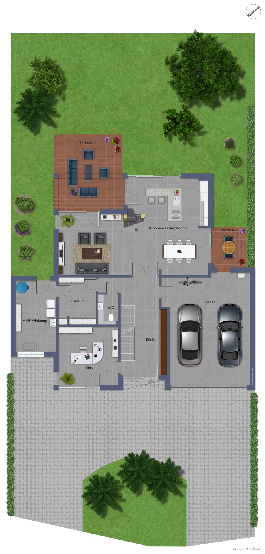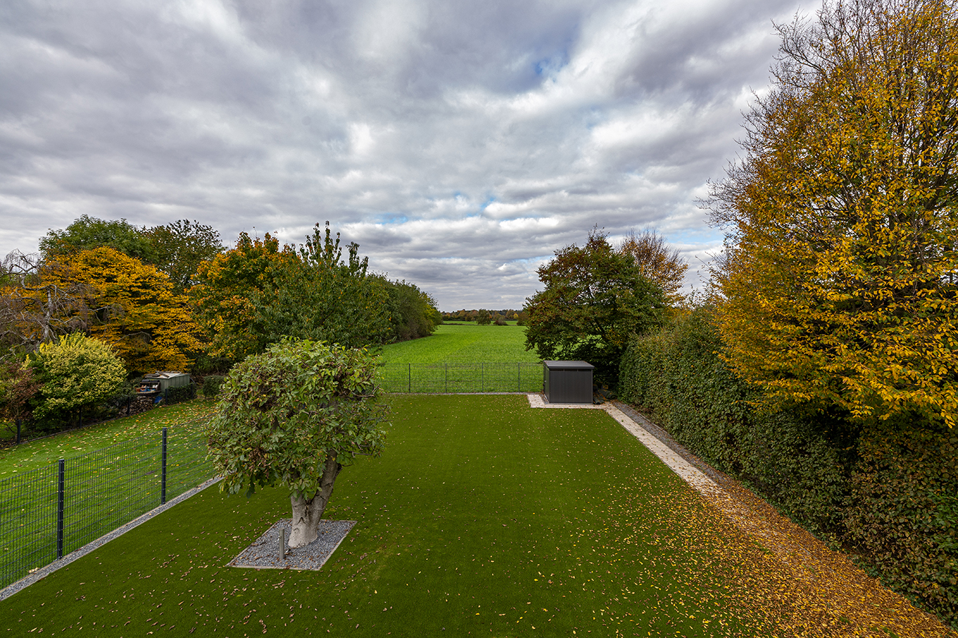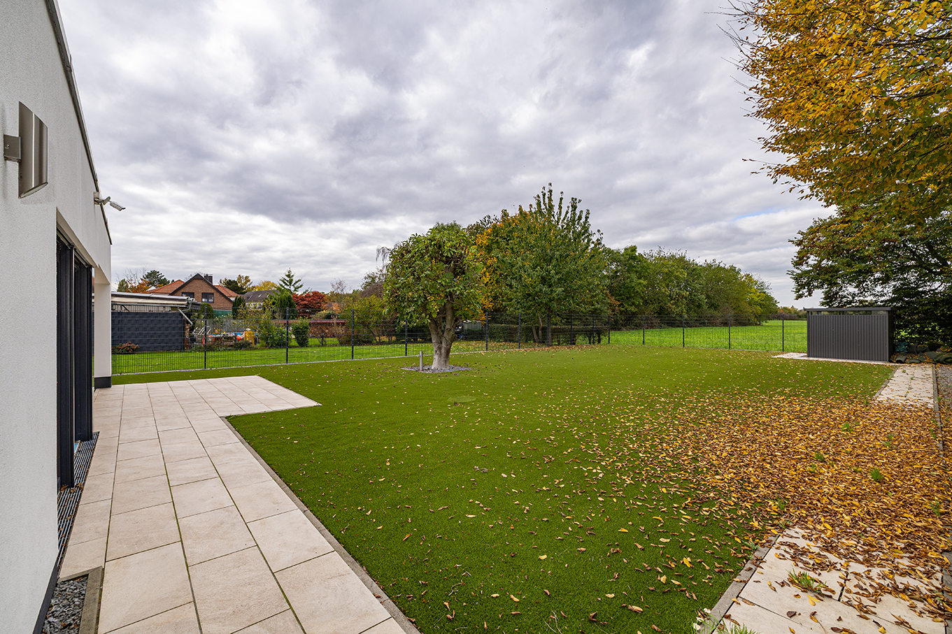 Das gesamte Grundstück wurde mit einem modernen, pflegeleichten Gartenkonzept gestaltet: klare Linien, ein strukturierter Heckensaum als natürlicher Sichtschutz und ein offenes Feldpanorama, das dem Grundstück eine unvergleichliche Großzügigkeit verleiht. Ein edler Solitärbaum setzt einen bewussten gestalterischen Akzent inmitten des weitläufigen Rasens.