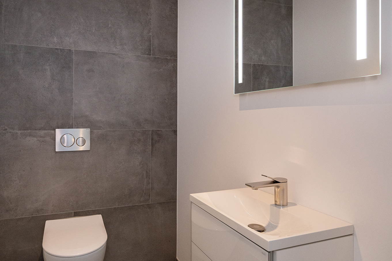 - Das Gäste-WC ist in seiner Reduktion ein echtes Designstatement: Wandfliesen in dunklem Steinlook treffen auf klare Armaturen und eine formschöne Waschtischanlage – schlicht, elegant und perfekt proportioniert.