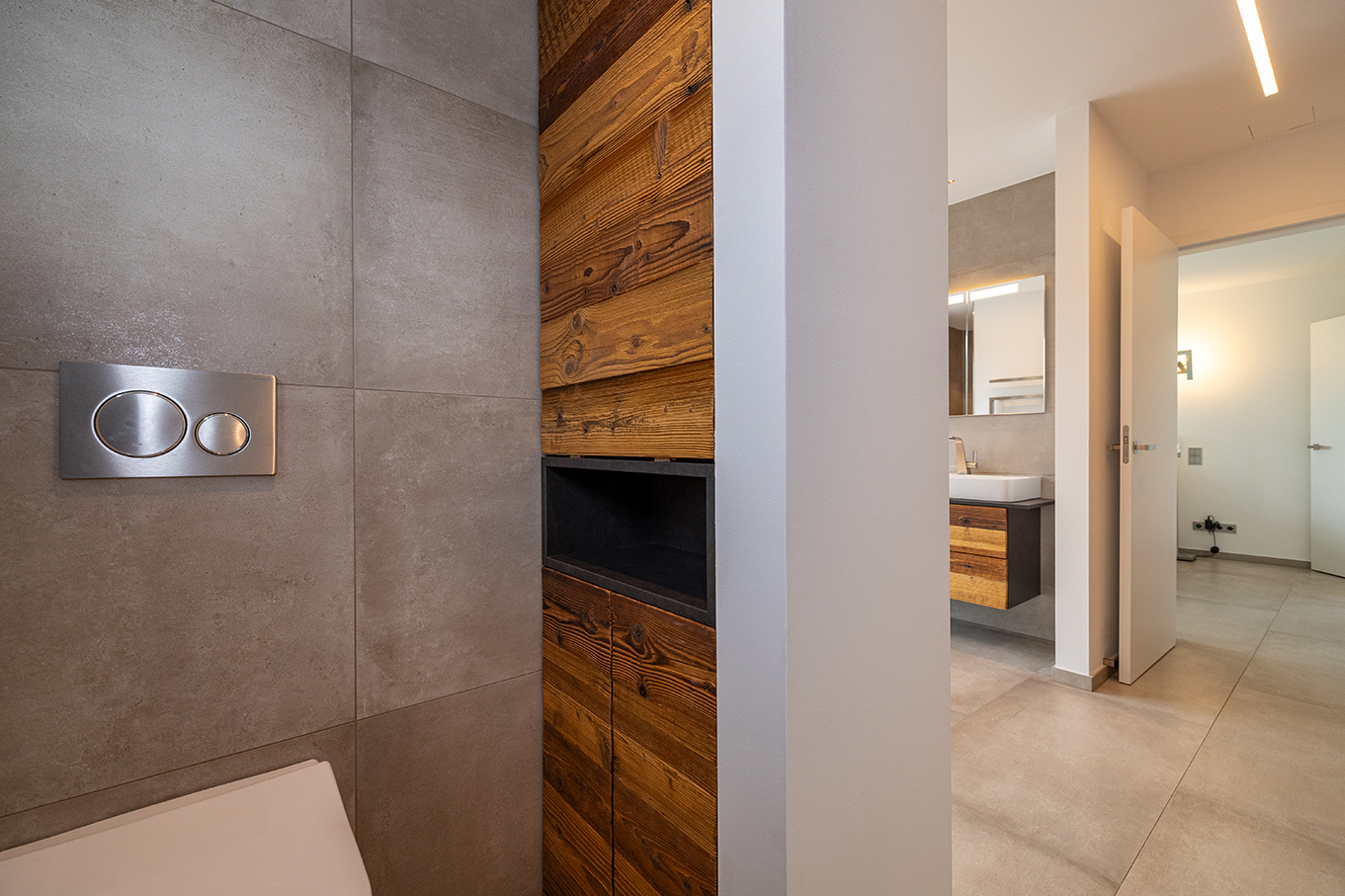 - Angrenzend daran befindet sich das exklusive Bad en Suite – ein architektonisches Highlight in sich. Großformatige Natursteinfliesen, Wände in erdigen Tönen und ausgewählte Materialien aus Holz und Betonoptik erzeugen eine luxuriöse, fast spaähnliche Stimmung. Die begehbare Dusche mit integrierter Sitzbank und Rainshower-System, ein Doppelwaschtisch mit handgefertigten Fronten aus Altholz und die bodentiefe Verglasung mit Blick auf die Terrasse machen diesen Raum zu einer privaten Wohlfühloase.