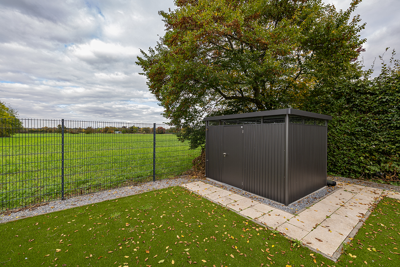 Auch funktional überzeugt das Anwesen: eine großzügige Doppelgarage mit elektrischen Toren, klare Zuwegung und ein modernes Nebengebäude aus Metall – ideal für Gartengeräte, Fahrräder oder sportliches Equipment.