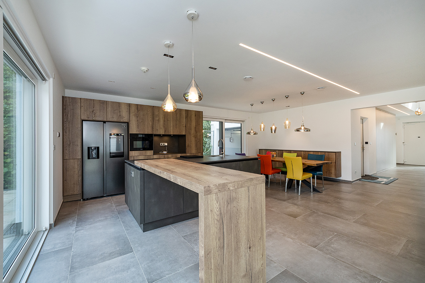 Das Herzstück bildet der weitläufige, offen gestaltete Wohn-, Ess- und Kochbereich. Großflächige Verglasungen lassen den Blick ungehindert über die Terrasse in den Garten und weiter in die Landschaft schweifen – ein Panorama, das den Innenraum mit der Natur verschmelzen lässt. Die luxuriöse Küche, mit einer eleganten Kombination aus warmen Holzoberflächen und dunklen, samtmatten Fronten, überzeugt durch klare Linien und eine hochwertige Ausstattung mit Geräten von Miele und Samsung.
