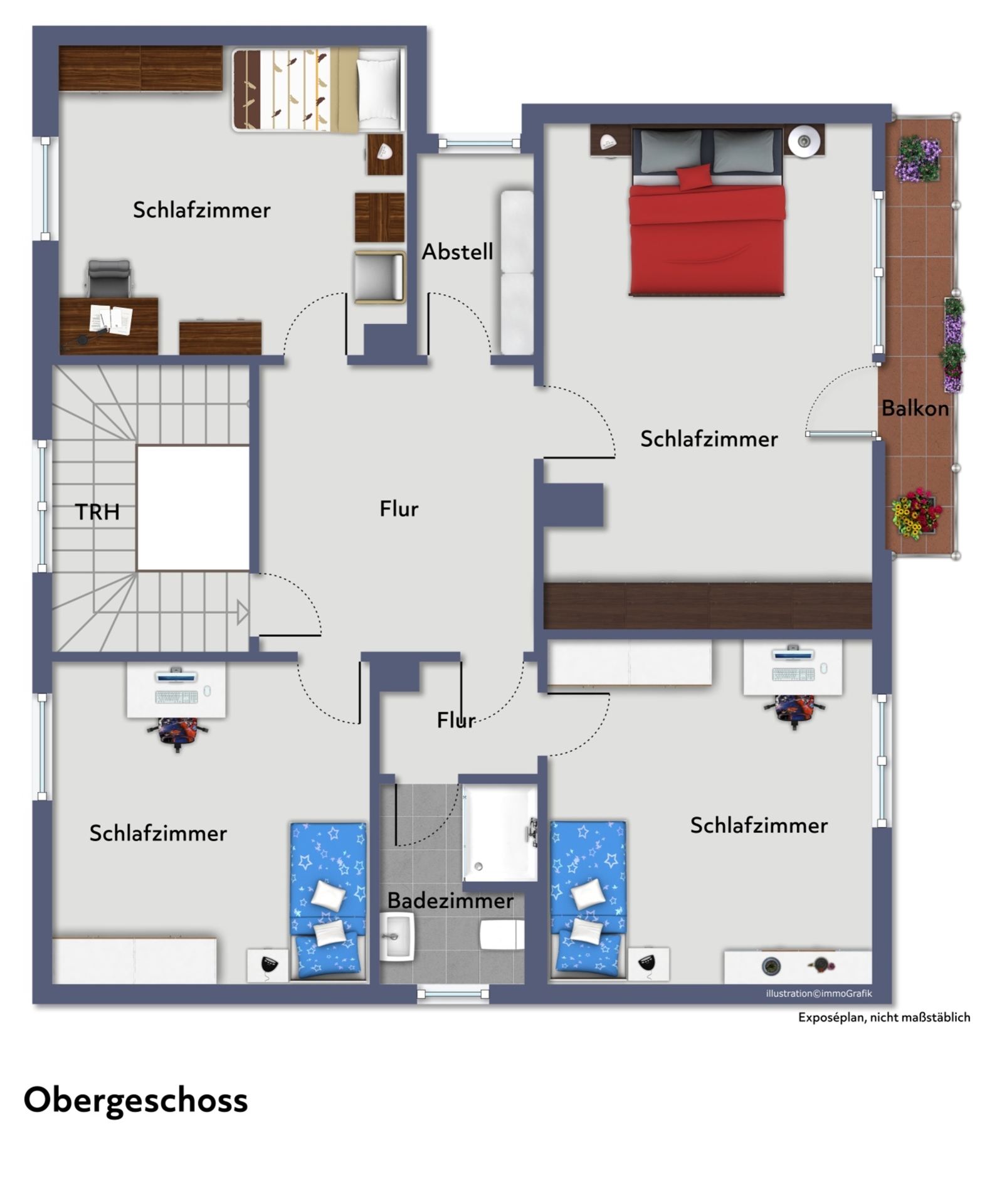 Das Obergeschoss überzeugt durch seine Großzügigkeit und Funktionalität. Insgesamt stehen vier Schlafzimmer zur Verfügung, von denen eines Zugang zu einem Balkon bietet. Ein weiteres Badezimmer sowie ein kleiner Abstellraum komplettieren diese Etage und machen sie ideal für den Alltag einer Familie.