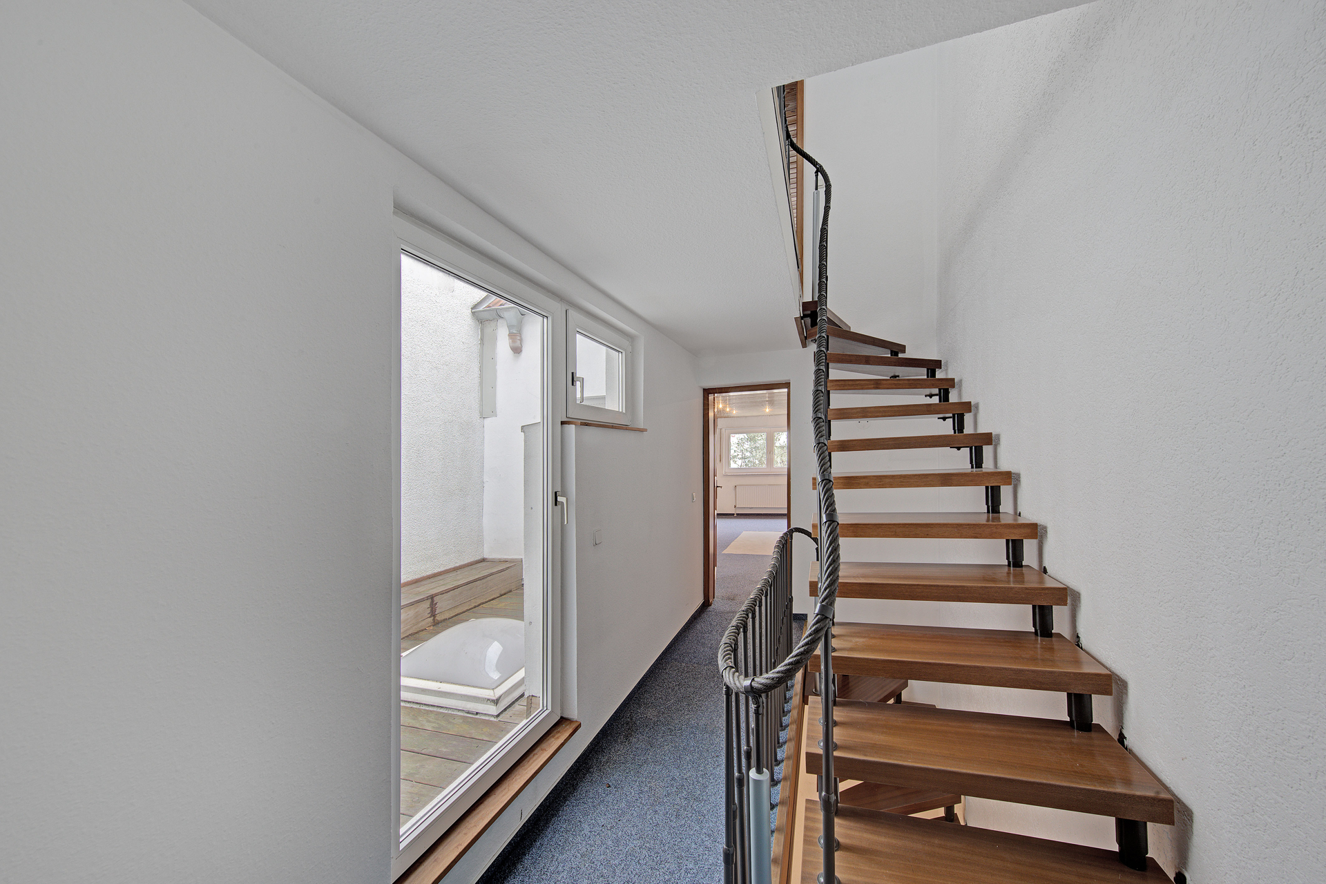 Hinter dem Haus öffnet sich eine schöne Garten-Terrasse, die – ebenso wie das Haus selbst – auf eine liebevolle Gestaltung wartet. Mit ein wenig grüner Hand entsteht hier schnell eine charmante Oase im Herzen der Stadt: perfekt für Sommerabende, Frühstück im Freien oder als Spielbereich für Kinder.