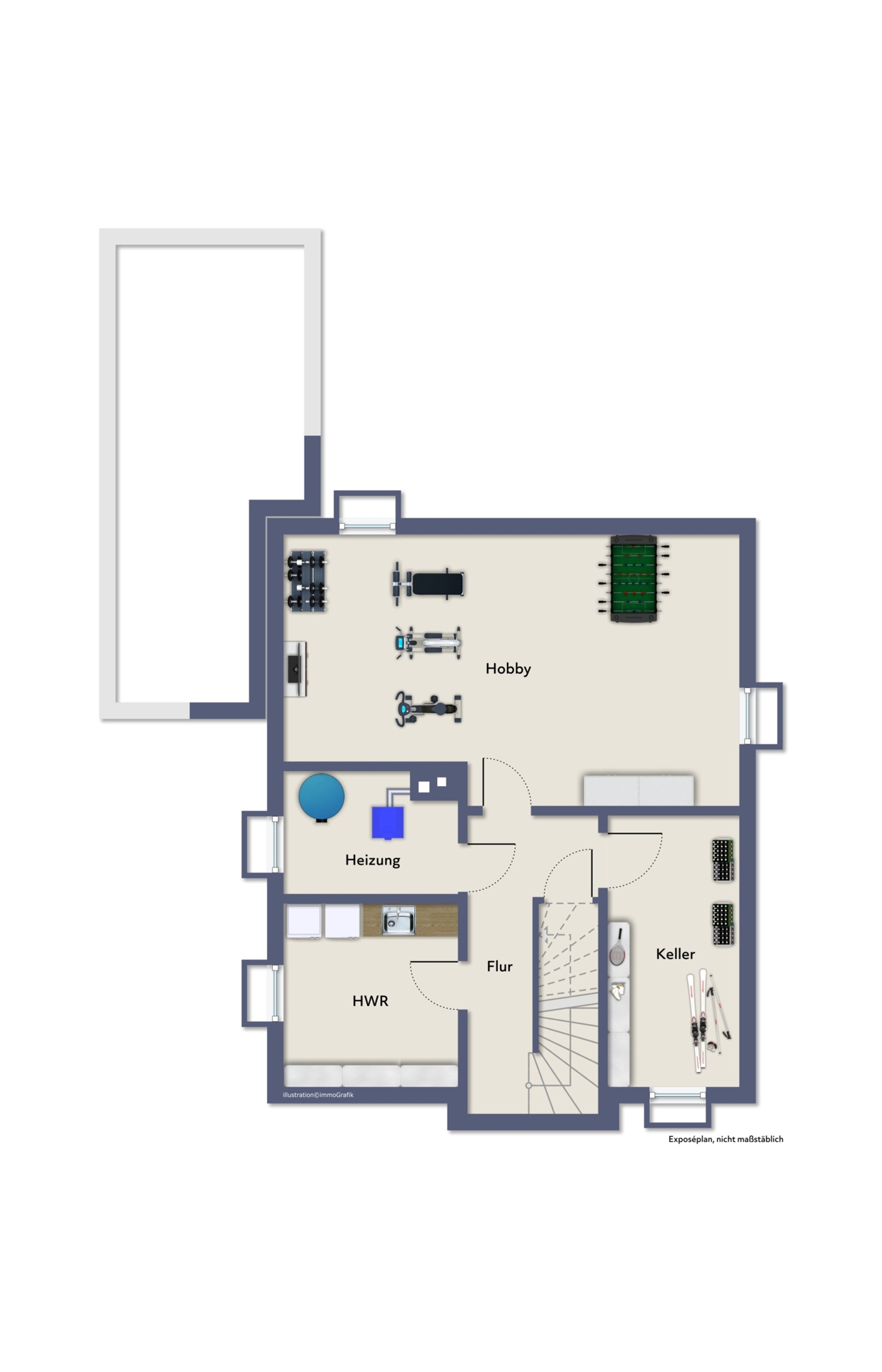 - Vollunterkellert: HWR, Heizungsraum, 2 Hobbyräume inklusive Starkstromanschluss