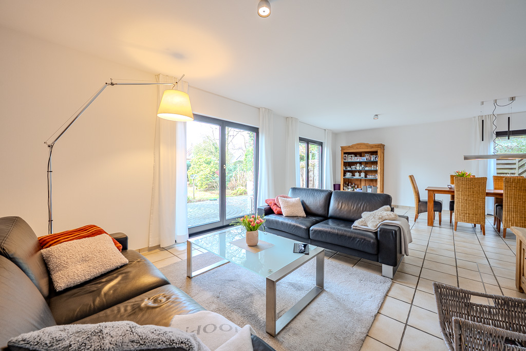 Bereits beim Betreten des Hauses spürt man die angenehme Atmosphäre. Das Herzstück bildet der rund 45 m² große, lichtdurchflutete Wohn- und Essbereich, der viel Platz für gemeinsame Stunden mit Familie und Freunden bietet. Große Fenster öffnen den Blick in den geschmackvoll angelegten Garten, während die Möglichkeit zur Installation eines Kamins zusätzlichen Wohnkomfort und gemütliche Abende verspricht. Die halboffene Küche fügt sich harmonisch in den Wohnbereich ein und macht das Zusammensein beim Kochen und Genießen besonders angenehm. Die hochwertige Einbauküche (Häcker) verbleibt im Objekt und ist im Kaufpreis enthalten. Ergänzt wird das Erdgeschoss durch ein großzügiges Arbeits- oder Gästezimmer sowie ein modernes Gäste-WC mit Dusche. Die Fußbodenheizung im gesamten Erdgeschoss sorgt dabei stets für wohlige Wärme.