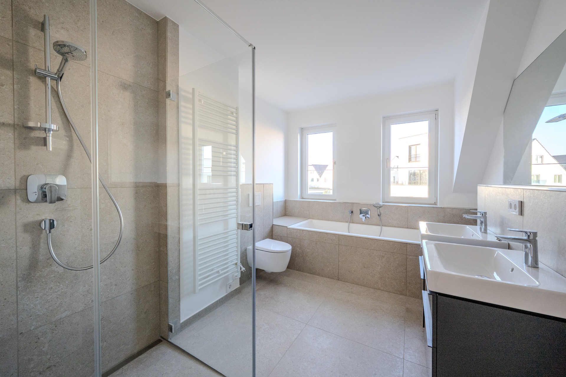 - Drei moderne Design-Bäder mit Markensanitäreinrichtung (EG Gäste-WC, je 1 Bad im OG u. DG)