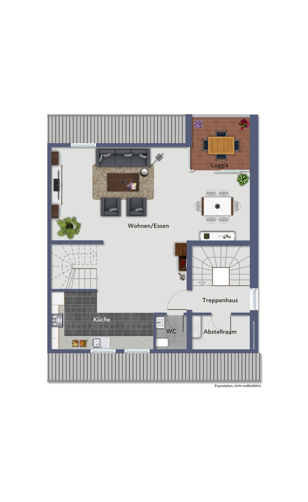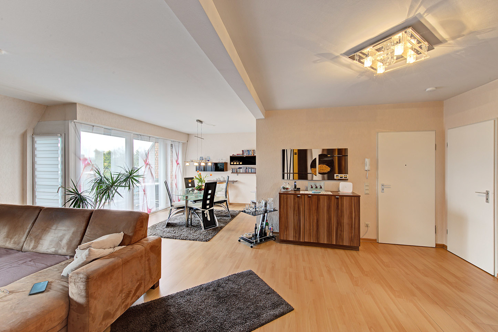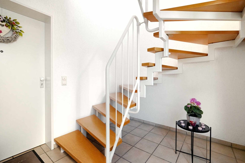 Die Maisonette-Wohnung im Obergeschoss verfügt über ca. 96m² Wohnfläche. Der offene Grundriss von Wohn-Esszimmer, Diele und Küche im 1.OG schafft mit ca. 55m² nicht nur Weiträumigkeit, sondern auch modernes Raumambiente. Mit etwas über 6m² Größe bietet die Loggia einen schönen Außenbereich mit Blick über die angrenzenden Gärten. Natürlich fehlt auch in dieser Wohnung ein Gäste-WC nicht. Eine Etage höher befindet sich, mit einem Schlafzimmer und einem großzügigen Tageslichtbadezimmer mit Badewanne und Dusche, die "Schlafetage".